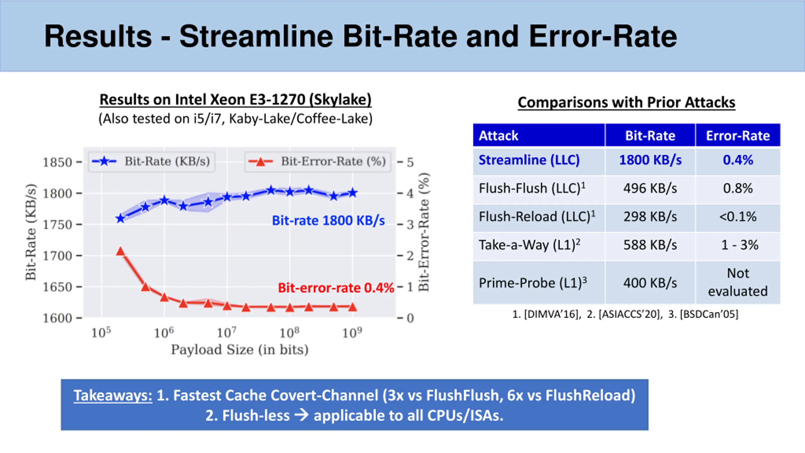 Results - Streamline Bit-Rate and Error-Rate Results on Intel Xeon E3-1270 (Skylake) (Also tested on i5/i7, Kaby-Lake/Coffee-Lake) Comparisons with Prior Attacks Attack Bit-Rate Error-Rate Streamline (LLC) 1800 KB/s 0.4% Flush-Flush (LLC)1 496 KB/s 0.8% Flush-Reload (LLC)1 298 KB/s <0.1% Bit-rate 1800 KB/s Take-a-Way (L1)2 588 KB/s 1 - 3% Not Prime-Probe (L1)3 400 KB/s Bit-error-rate 0.4% evaluated 1. [DIMVA 16], 2. [ASIACCS 20], 3. [BSDCan 05] Takeaways: 1. Fastest Cache Covert-Channel (3x vs FlushFlush, 6x vs FlushReload) 2. Flush-less applicable to all CPUs/ISAs.