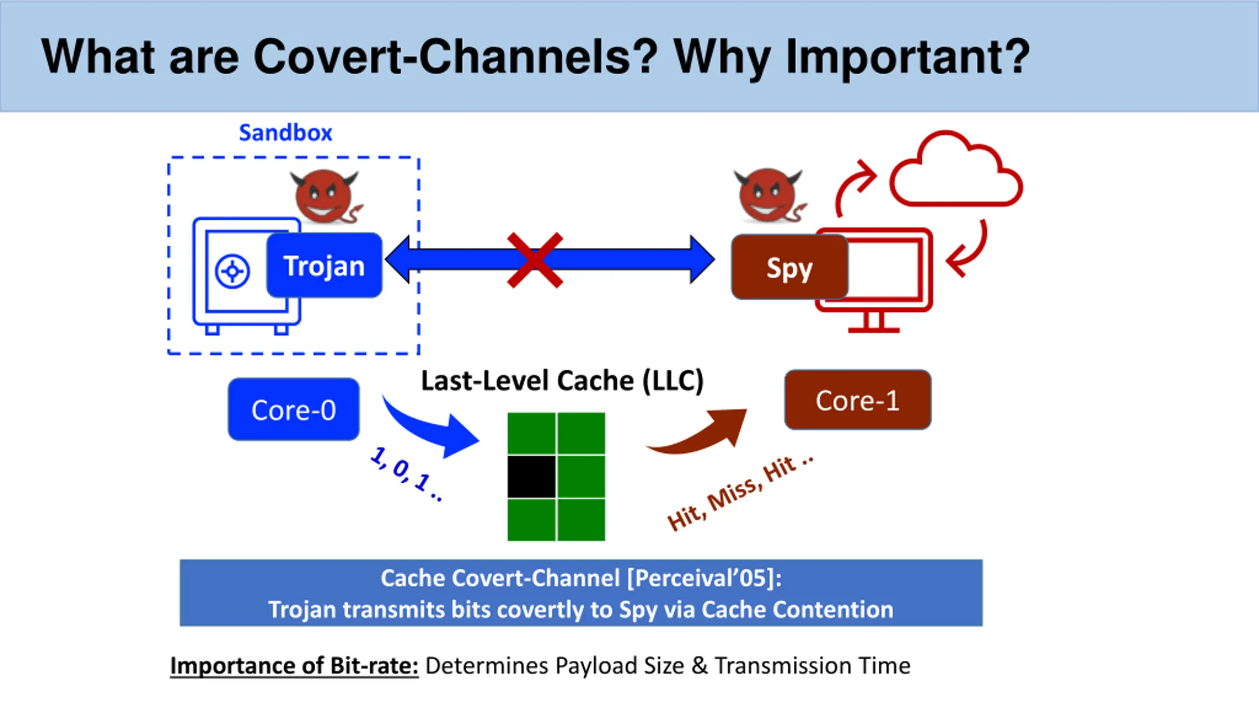 What are Covert-Channels? Why Important? Sandbox Trojan Spy Last-Level Cache (LLC) Core-1 Core-0 Cache Covert-Channel [Perceival 05]: Trojan transmits bits covertly to Spy via Cache Contention Importance of Bit-rate: Determines Payload Size & Transmission Time