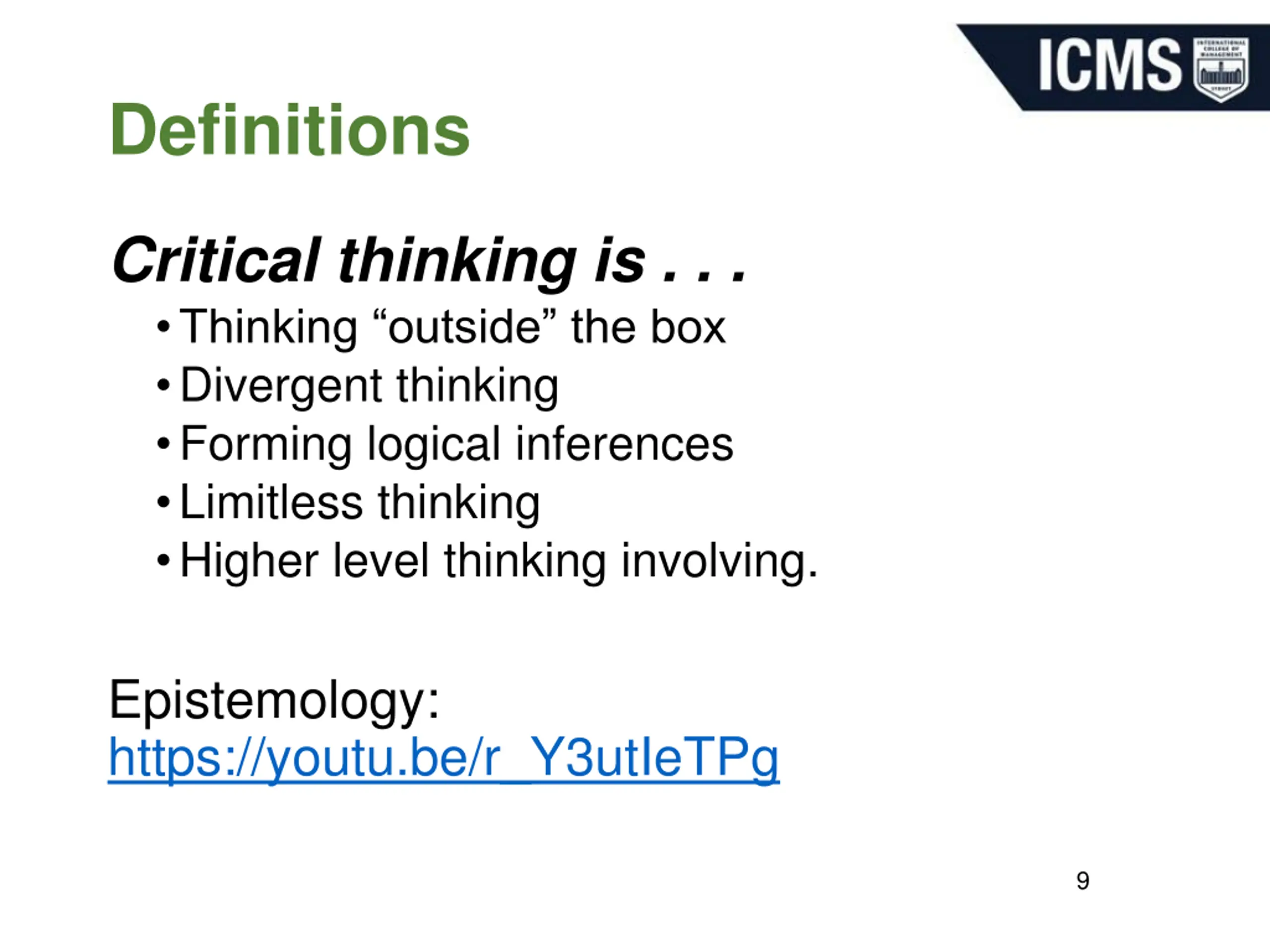 Definitions Critical thinking is . . . Thinking outside the box Divergent thinking Forming logical inferences Limitless thinking Higher level thinking involving. Epistemology: https://youtu.be/r_Y3utIeTPg 9