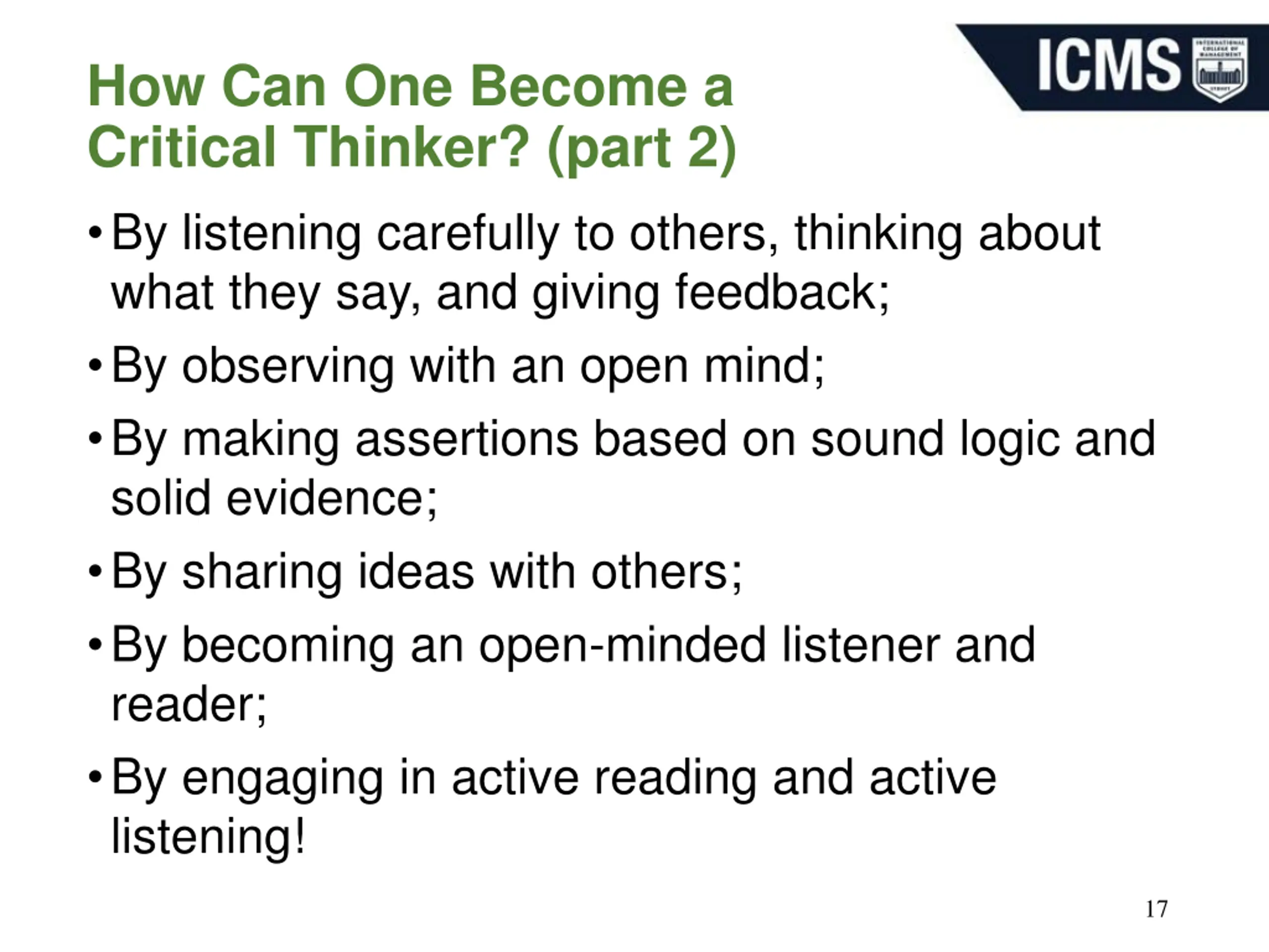 How Can One Become a Critical Thinker? (part 2) By listening carefully to others, thinking about what they say, and giving feedback; By observing with an open mind; By making assertions based on sound logic and solid evidence; By sharing ideas with others; By becoming an open-minded listener and reader; By engaging in active reading and active listening! 17