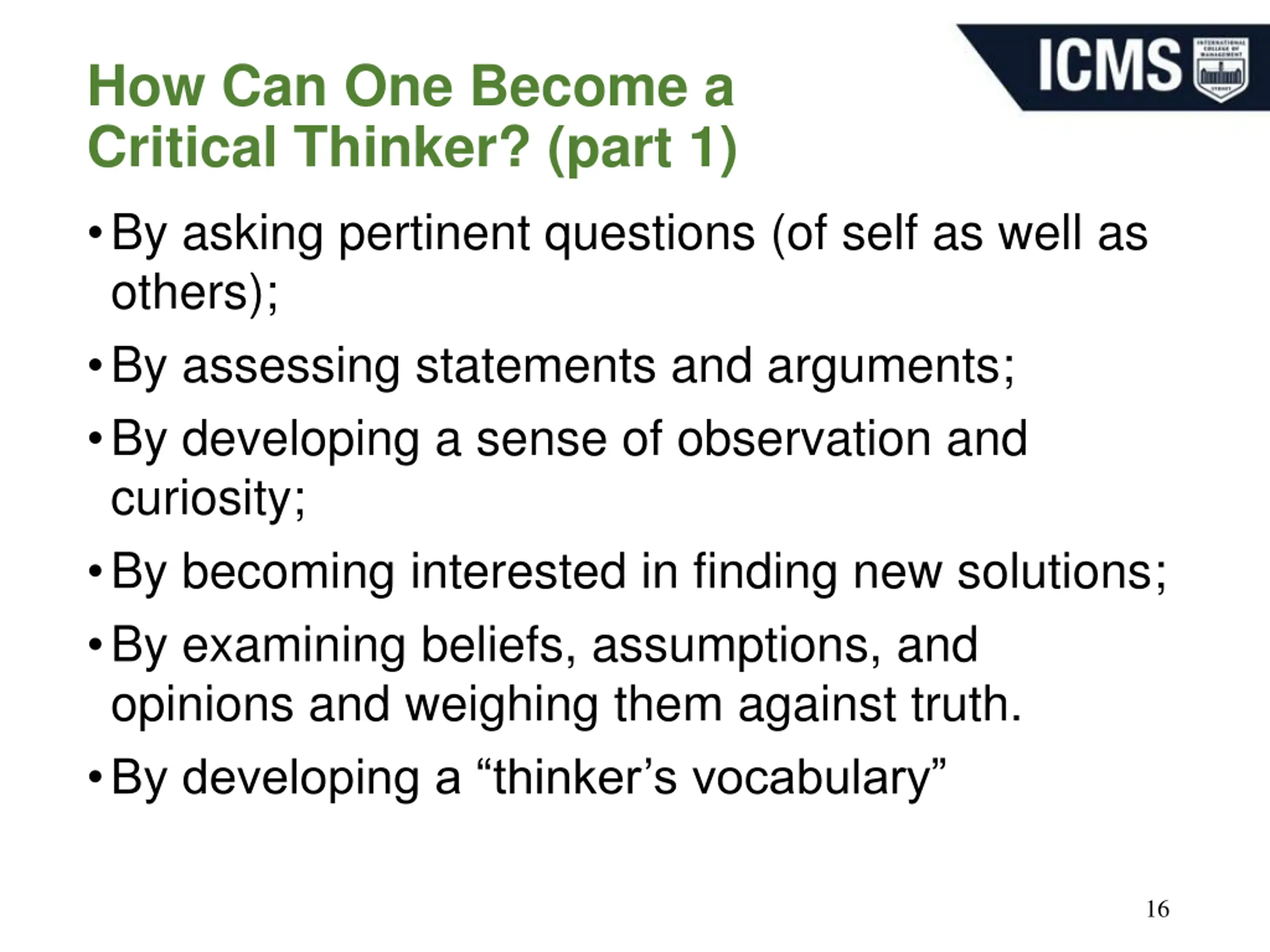 How Can One Become a Critical Thinker? (part 1) By asking pertinent questions (of self as well as others); By assessing statements and arguments; By developing a sense of observation and curiosity; By becoming interested in finding new solutions; By examining beliefs, assumptions, and opinions and weighing them against truth. By developing a thinker s vocabulary 16