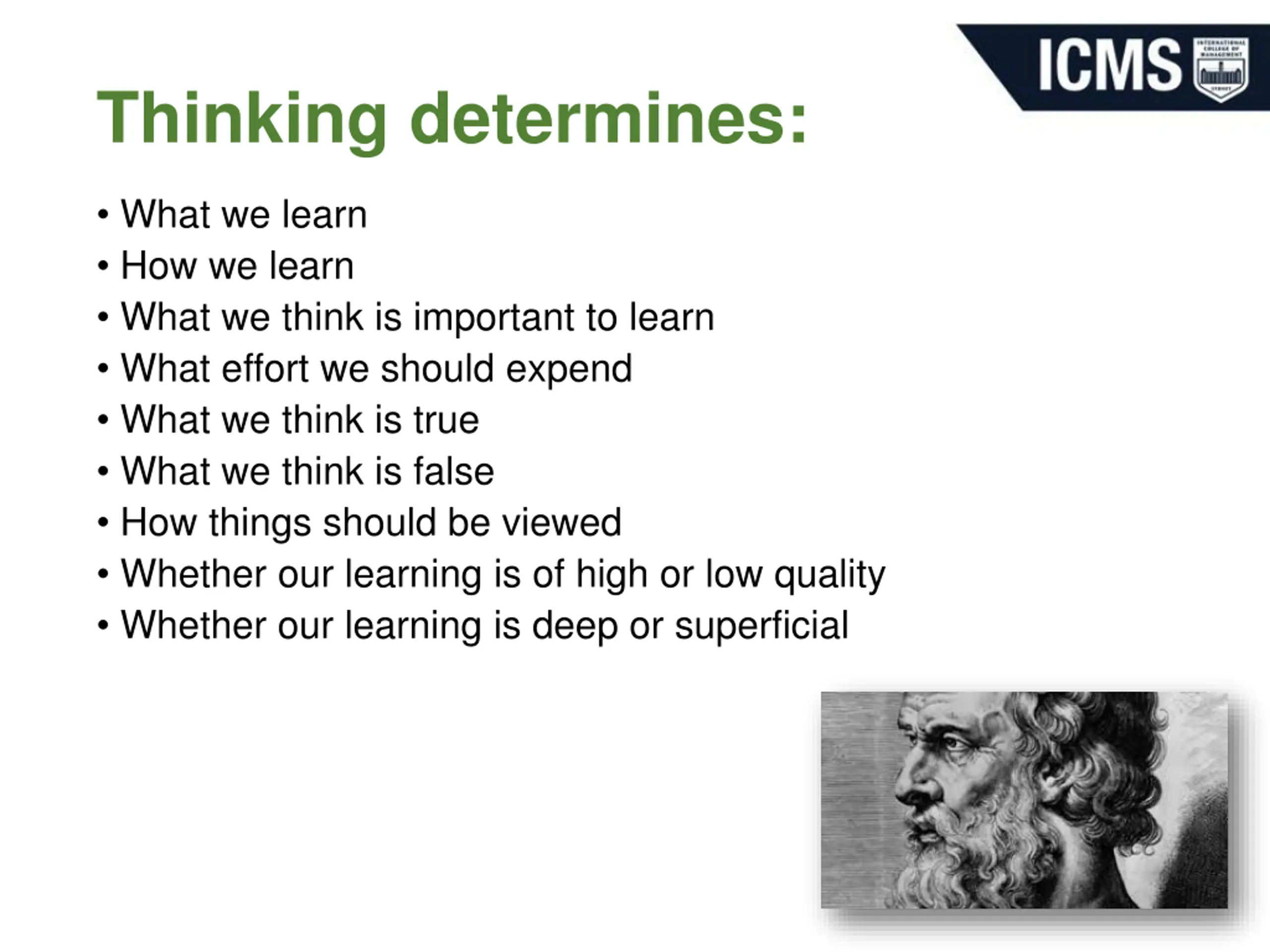 Thinking determines: What we learn How we learn What we think is important to learn What effort we should expend What we think is true What we think is false How things should be viewed Whether our learning is of high or low quality Whether our learning is deep or superficial