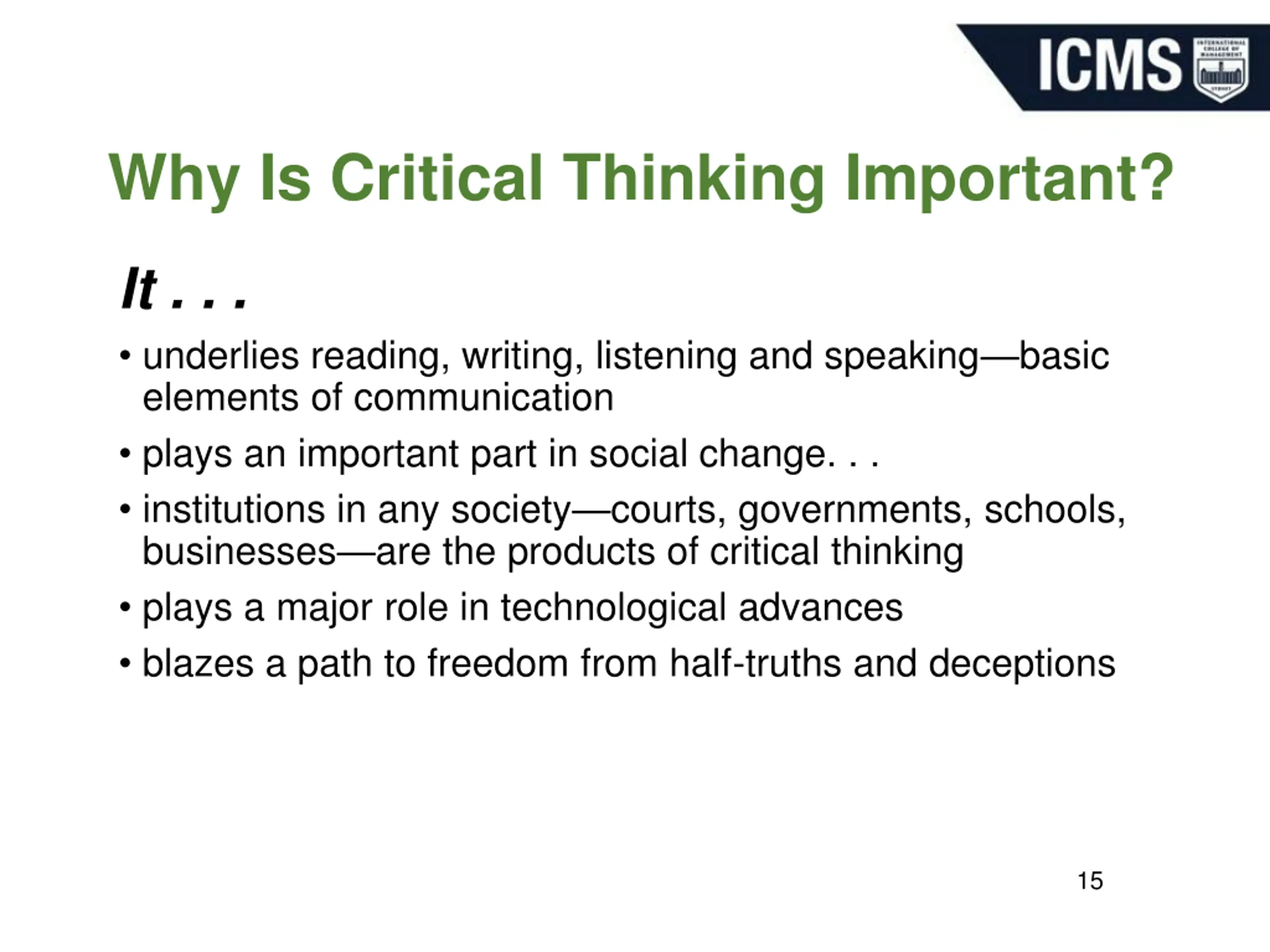 Why Is Critical Thinking Important? It . . . underlies reading, writing, listening and speaking basic elements of communication plays an important part in social change. . . institutions in any society courts, governments, schools, businesses are the products of critical thinking plays a major role in technological advances blazes a path to freedom from half-truths and deceptions 15