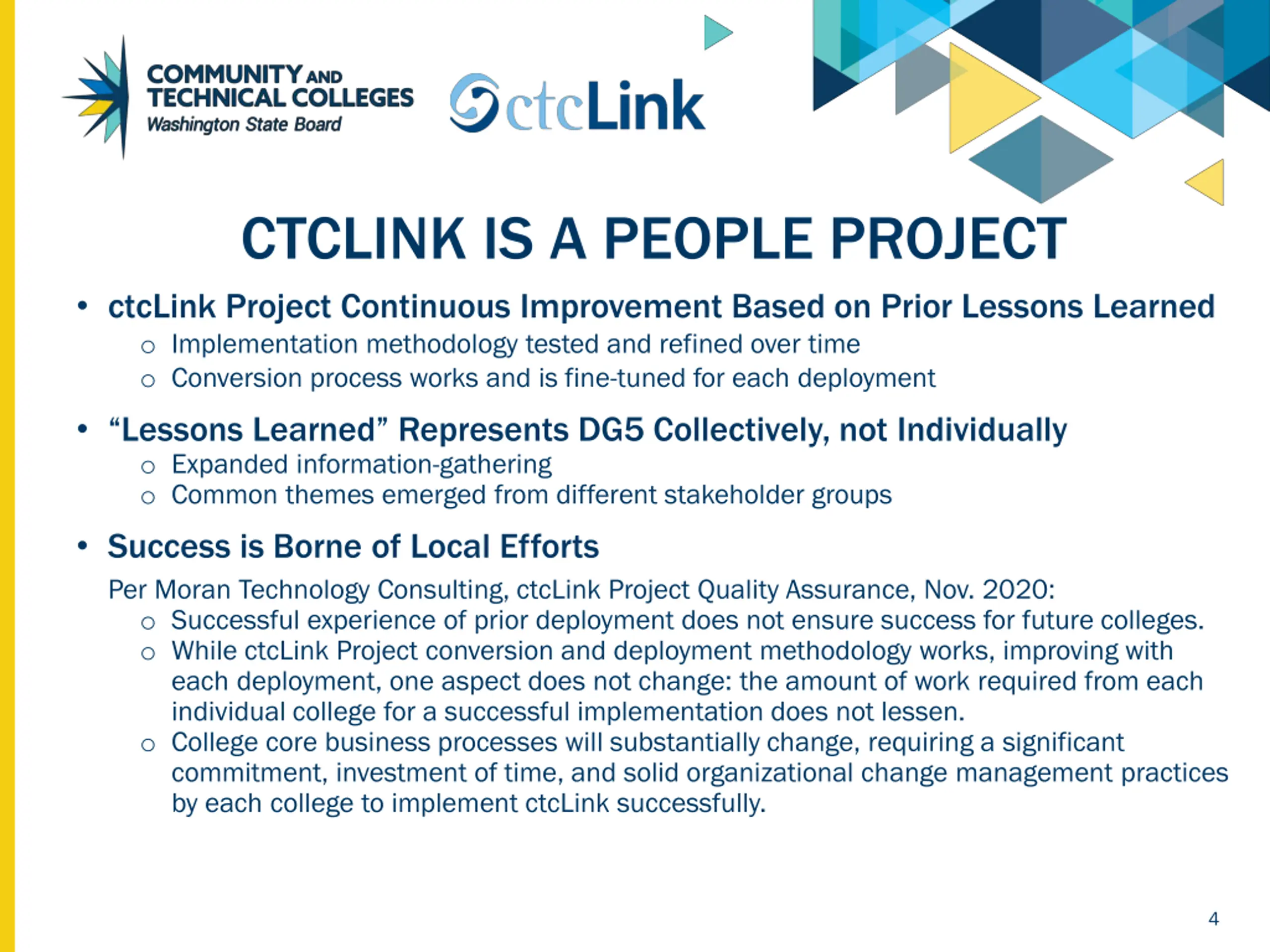 CTCLINK IS A PEOPLE PROJECT ctcLink Project Continuous Improvement Based on Prior Lessons Learned o Implementation methodology tested and refined over time o Conversion process works and is fine-tuned for each deployment Lessons Learned Represents DG5 Collectively, not Individually o Expanded information-gathering o Common themes emerged from different stakeholder groups Success is Borne of Local Efforts Per Moran Technology Consulting, ctcLink Project Quality Assurance, Nov. 2020: o Successful experience of prior deployment does not ensure success for future colleges. o While ctcLink Project conversion and deployment methodology works, improving with each deployment, one aspect does not change: the amount of work required from each individual college for a successful implementation does not lessen. o College core business processes will substantially change, requiring a significant commitment, investment of time, and solid organizational change management practices by each college to implement ctcLink successfully. 4