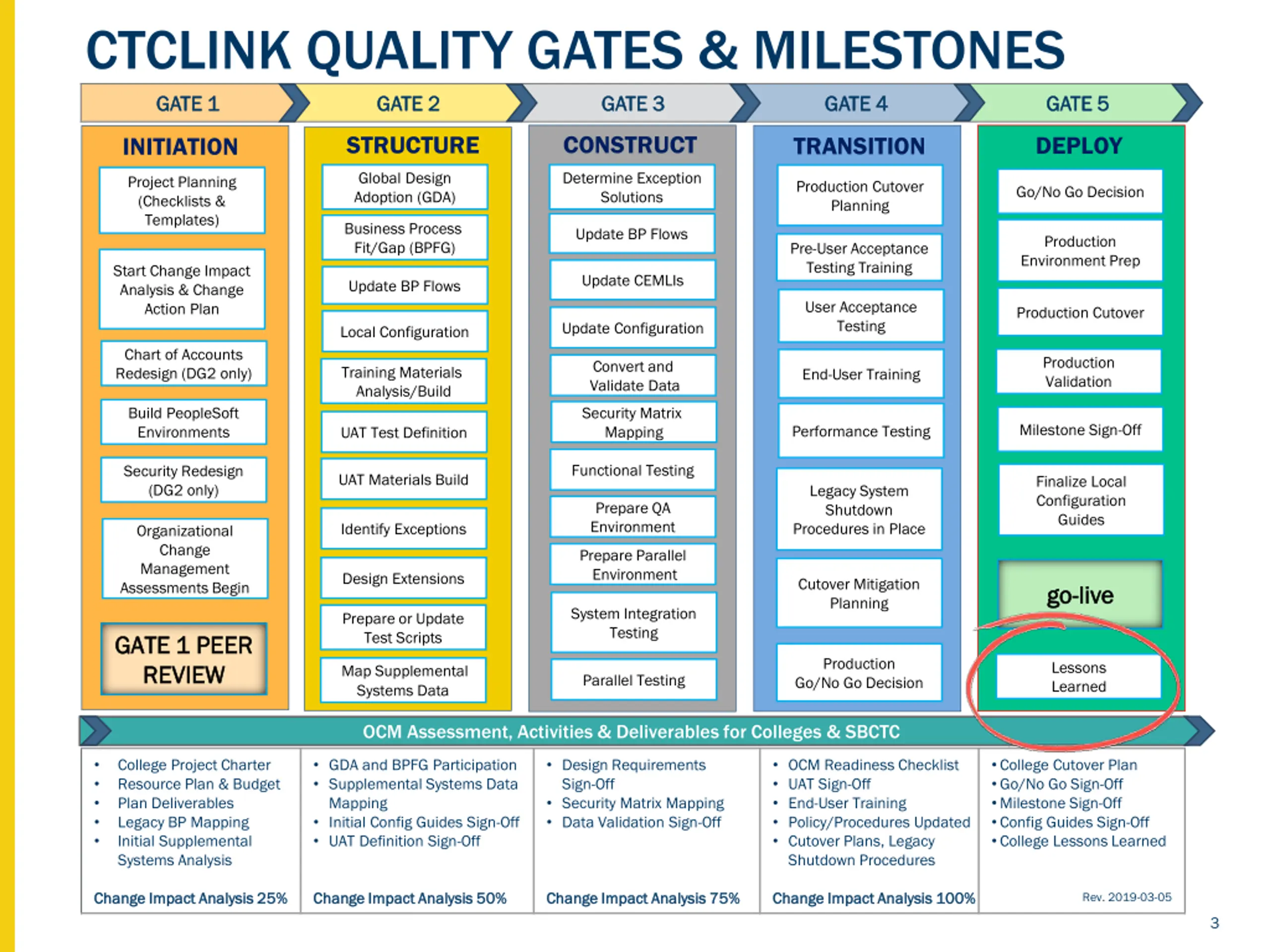 CTCLINK QUALITY GATES & MILESTONES GATE 1 GATE 1 GATE 2 GATE 2 GATE 3 GATE 3 GATE 4 GATE 4 GATE 5 GATE 5 CONSTRUCT STRUCTURE DEPLOY TRANSITION INITIATION Global Design Adoption (GDA) Determine Exception Solutions Project Planning Production Cutover Planning Go/No Go Decision CTCLINK QUALITY GATES & MILESTONES (Checklists & Templates) Business Process Fit/Gap (BPFG) Update BP Flows Production Environment Prep Pre-User Acceptance Testing Training Start Change Impact Analysis & Change Action Plan Update CEMLIs Update BP Flows User Acceptance Testing Production Cutover Update Configuration Local Configuration Chart of Accounts Redesign (DG2 only) Production Validation Convert and Validate Data Training Materials Analysis/Build End-User Training Build PeopleSoft Environments Security Matrix Mapping Milestone Sign-Off Performance Testing UAT Test Definition Functional Testing Security Redesign (DG2 only) UAT Materials Build Finalize Local Configuration Guides Legacy System Shutdown Procedures in Place Prepare QA Environment Identify Exceptions Organizational Change Management Assessments Begin Prepare Parallel Environment Design Extensions Cutover Mitigation Planning go go- -live live System Integration Testing Prepare or Update Test Scripts GATE 1 PEER GATE 1 PEER REVIEW REVIEW Production Go/No Go Decision Lessons Learned Map Supplemental Systems Data Parallel Testing OCM Assessment, Activities & Deliverables for Colleges & SBCTC College Project Charter Resource Plan & Budget Plan Deliverables Legacy BP Mapping Initial Supplemental Systems Analysis GDA and BPFG Participation Supplemental Systems Data Mapping Initial Config Guides Sign-Off UAT Definition Sign-Off Design Requirements Sign-Off Security Matrix Mapping Data Validation Sign-Off OCM Readiness Checklist UAT Sign-Off End-User Training Policy/Procedures Updated Cutover Plans, Legacy Shutdown Procedures College Cutover Plan Go/No Go Sign-Off Milestone Sign-Off Config Guides Sign-Off College Lessons Learned Change Impact Analysis 25% Change Impact Analysis 25% Change Impact Analysis 50% Change Impact Analysis 50% Change Impact Analysis 75% Change Impact Analysis 75% Change Impact Analysis 100% Change Impact Analysis 100% Rev. 2019-03-05 3