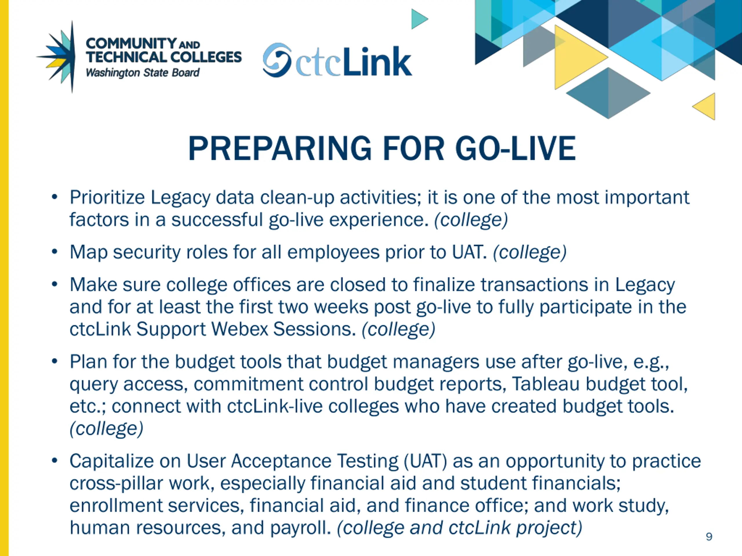 PREPARING FOR GO-LIVE Prioritize Legacy data clean-up activities; it is one of the most important factors in a successful go-live experience. (college) Map security roles for all employees prior to UAT. (college) Make sure college offices are closed to finalize transactions in Legacy and for at least the first two weeks post go-live to fully participate in the ctcLink Support Webex Sessions. (college) Plan for the budget tools that budget managers use after go-live, e.g., query access, commitment control budget reports, Tableau budget tool, etc.; connect with ctcLink-live colleges who have created budget tools. (college) Capitalize on User Acceptance Testing (UAT) as an opportunity to practice cross-pillar work, especially financial aid and student financials; enrollment services, financial aid, and finance office; and work study, human resources, and payroll. (college and ctcLink project) 9