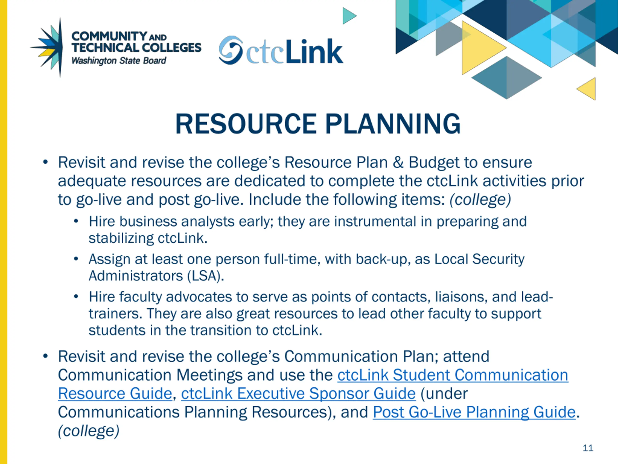 RESOURCE PLANNING Revisit and revise the college s Resource Plan & Budget to ensure adequate resources are dedicated to complete the ctcLink activities prior to go-live and post go-live. Include the following items: (college) Hire business analysts early; they are instrumental in preparing and stabilizing ctcLink. Assign at least one person full-time, with back-up, as Local Security Administrators (LSA). Hire faculty advocates to serve as points of contacts, liaisons, and lead- trainers. They are also great resources to lead other faculty to support students in the transition to ctcLink. Revisit and revise the college s Communication Plan; attend Communication Meetings and use the ctcLink Student Communication Resource Guide, ctcLink Executive Sponsor Guide (under Communications Planning Resources), and Post Go-Live Planning Guide. (college) 11