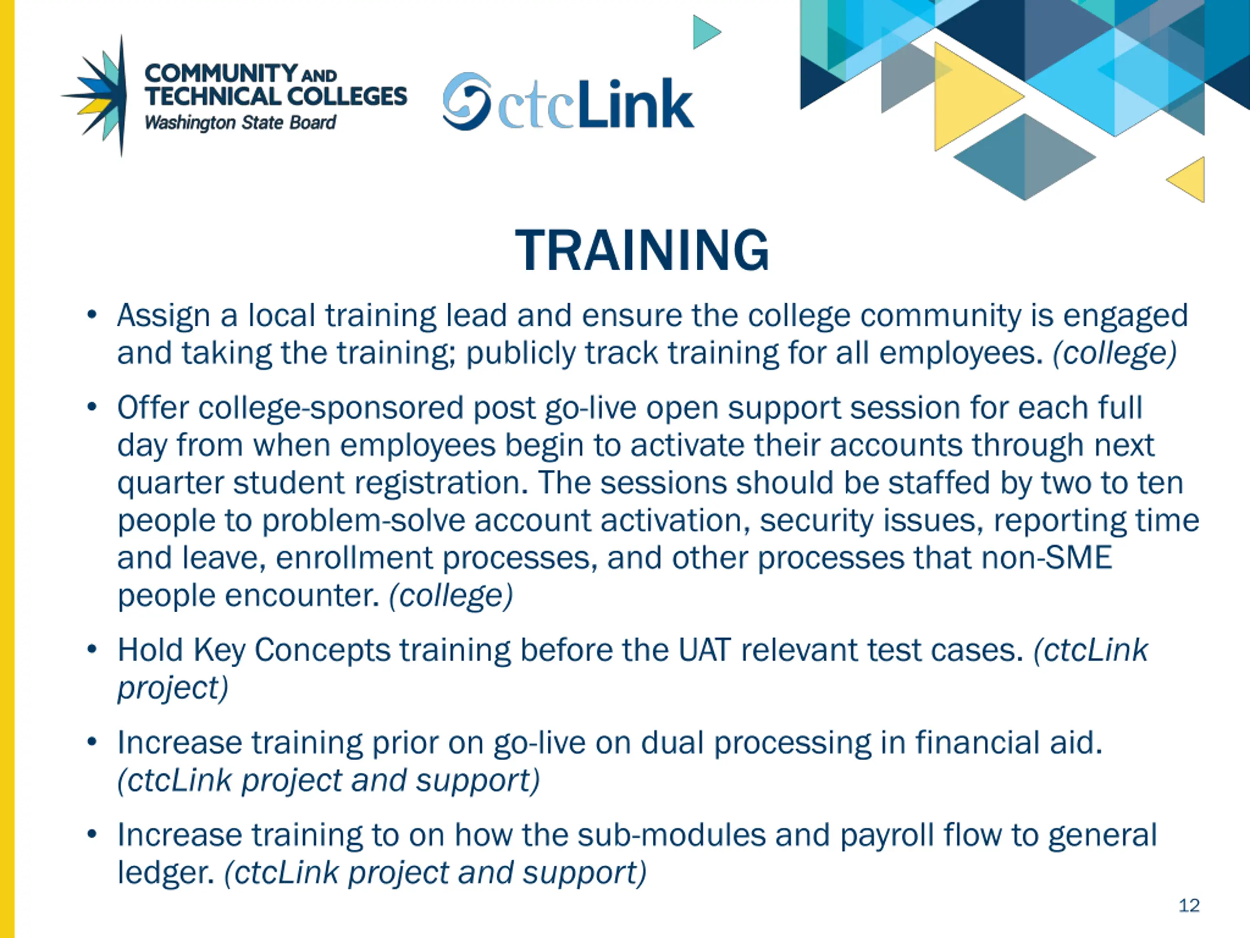 TRAINING Assign a local training lead and ensure the college community is engaged and taking the training; publicly track training for all employees. (college) Offer college-sponsored post go-live open support session for each full day from when employees begin to activate their accounts through next quarter student registration. The sessions should be staffed by two to ten people to problem-solve account activation, security issues, reporting time and leave, enrollment processes, and other processes that non-SME people encounter. (college) Hold Key Concepts training before the UAT relevant test cases. (ctcLink project) Increase training prior on go-live on dual processing in financial aid. (ctcLink project and support) Increase training to on how the sub-modules and payroll flow to general ledger. (ctcLink project and support) 12