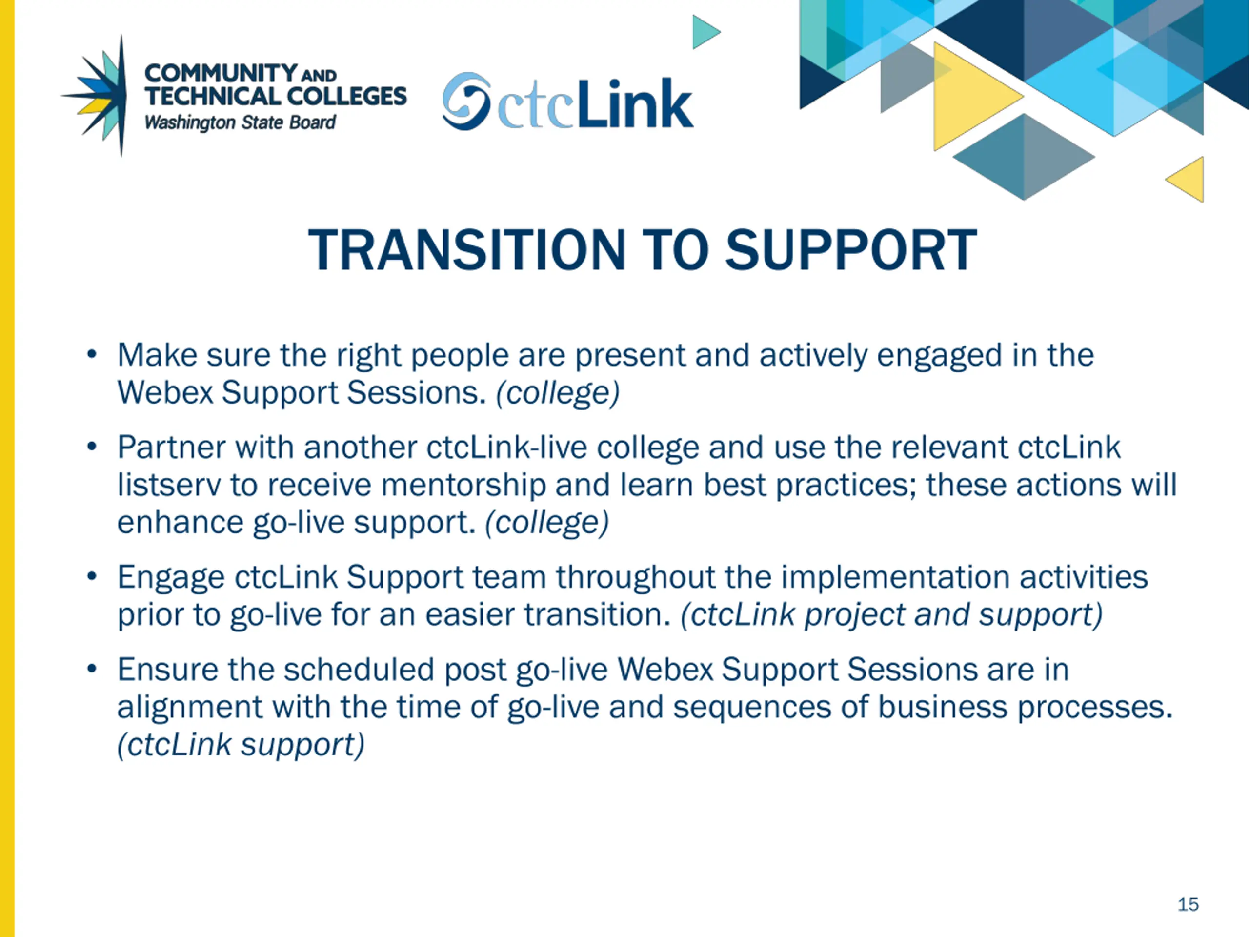 TRANSITION TO SUPPORT Make sure the right people are present and actively engaged in the Webex Support Sessions. (college) Partner with another ctcLink-live college and use the relevant ctcLink listserv to receive mentorship and learn best practices; these actions will enhance go-live support. (college) Engage ctcLink Support team throughout the implementation activities prior to go-live for an easier transition. (ctcLink project and support) Ensure the scheduled post go-live Webex Support Sessions are in alignment with the time of go-live and sequences of business processes. (ctcLink support) 15