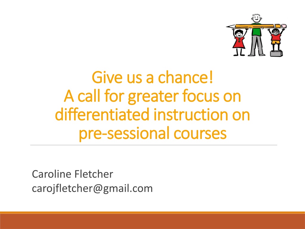 Give us a chance! Give us a chance! A call for greater focus on A call for greater focus on differentiated instruction on differentiated instruction on pre pre- -sessional courses sessional courses Caroline Fletcher carojfletcher@gmail.com