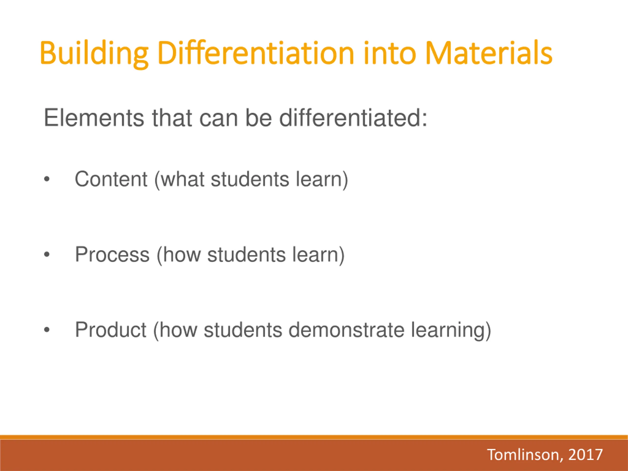 Building Differentiation into Materials Building Differentiation into Materials Elements that can be differentiated: Content (what students learn) Process (how students learn) Product (how students demonstrate learning) Tomlinson, 2017