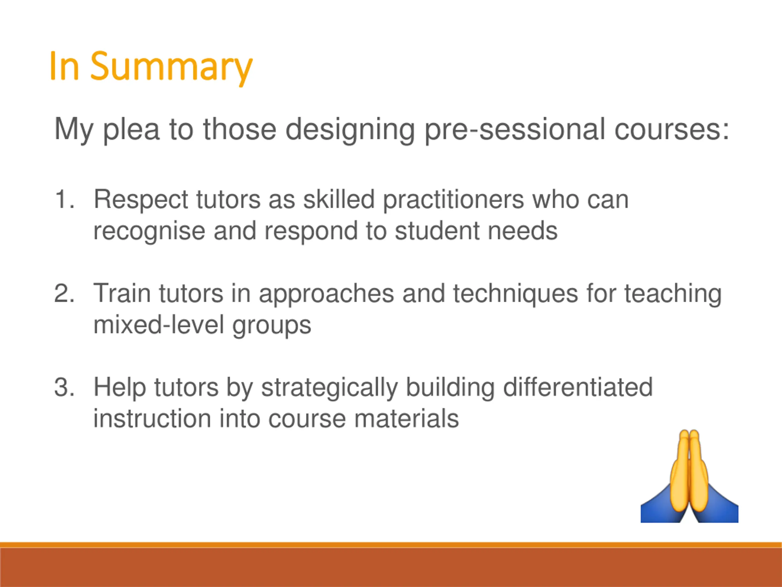 In Summary In Summary My plea to those designing pre-sessional courses: 1. Respect tutors as skilled practitioners who can recognise and respond to student needs 2. Train tutors in approaches and techniques for teaching mixed-level groups 3. Help tutors by strategically building differentiated instruction into course materials
