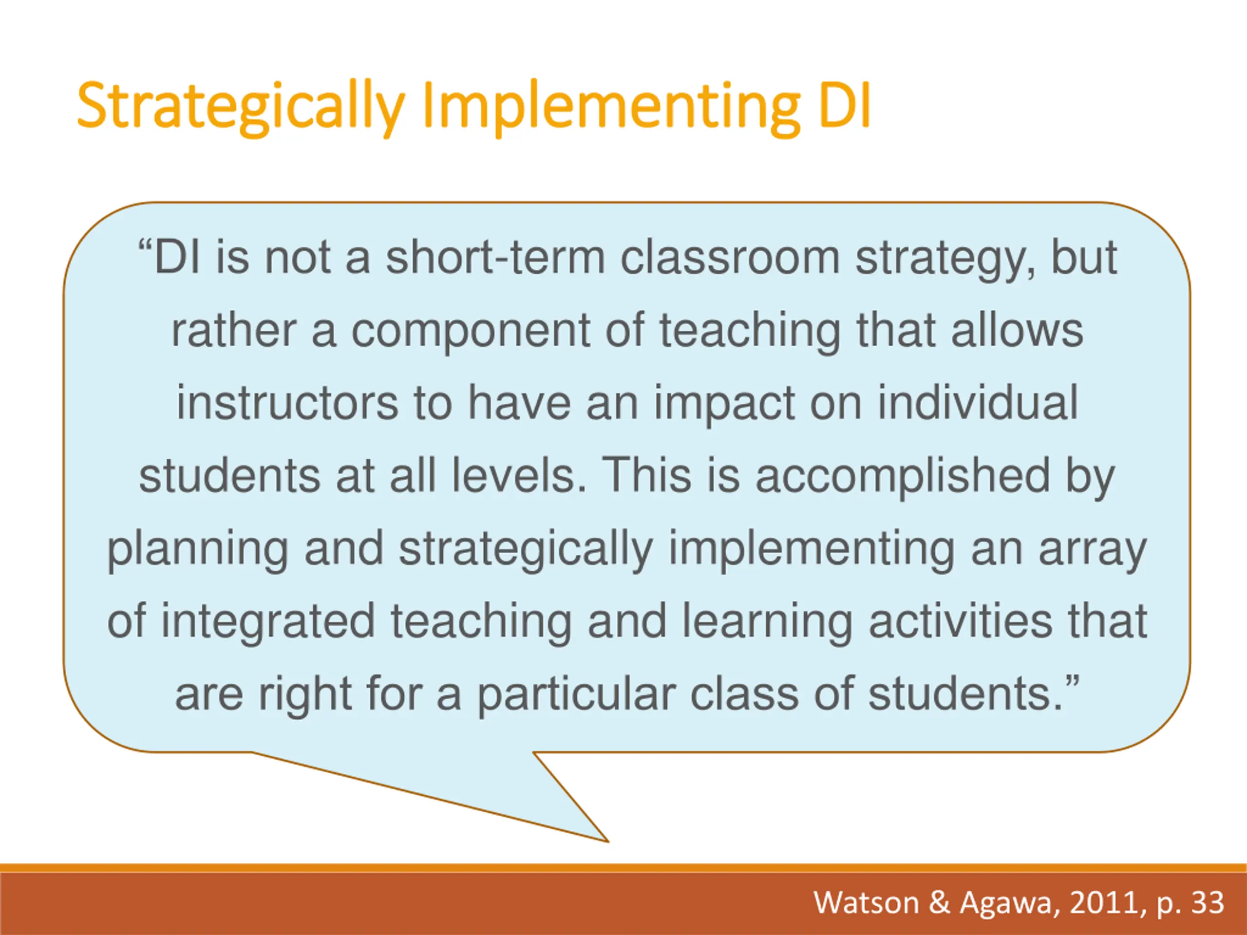 Strategically Strategically Implementing ImplementingDI DI DI is not a short-term classroom strategy, but rather a component of teaching that allows instructors to have an impact on individual students at all levels. This is accomplished by planning and strategically implementing an array of integrated teaching and learning activities that are right for a particular class of students. Watson & Agawa, 2011, p. 33