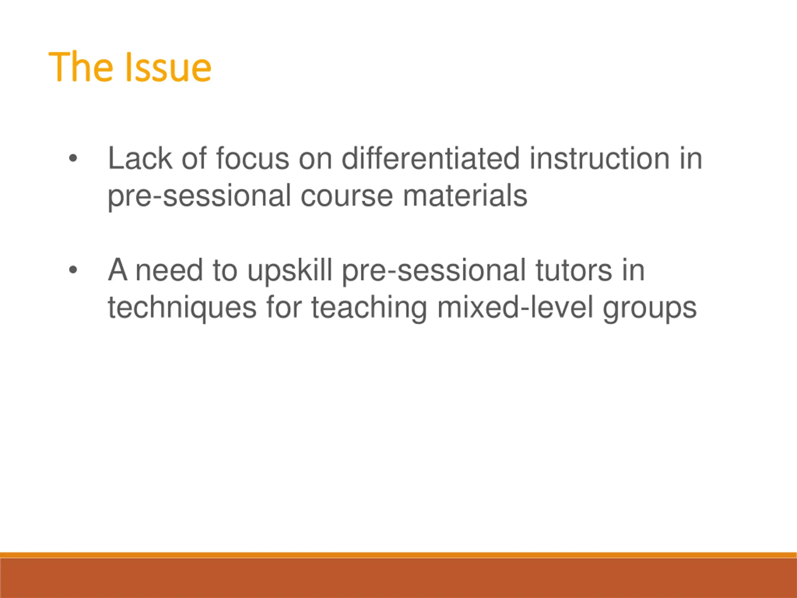 The Issue The Issue Lack of focus on differentiated instruction in pre-sessional course materials A need to upskill pre-sessional tutors in techniques for teaching mixed-level groups