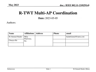 January 2020 doc.: IEEE 802.11-20/0093r2 RLLML rules of operation (I) An AP willing to provide low latency access may, as an example, have 8x20MHz links on a continuous 160MHz frequency band Let s call these 8 links a RLLML set If implementing RLLML, such an AP shall indicate to its associated STAs that it will 1) run separate carrier sense and access mechanisms per link, and 2) receive or transmit data only on one link at a time The associated STAs also inform their serving AP of these capabilities Backoff Link 1 @channel 1 Link 1 @channel 1 Non- AP multi- link device AP multi- link device Backoff Backoff Link 8 @channel 8 Link 8 @channel 8 Backoff Submission Slide 9 Adrian Garcia Rodriguez, Nokia