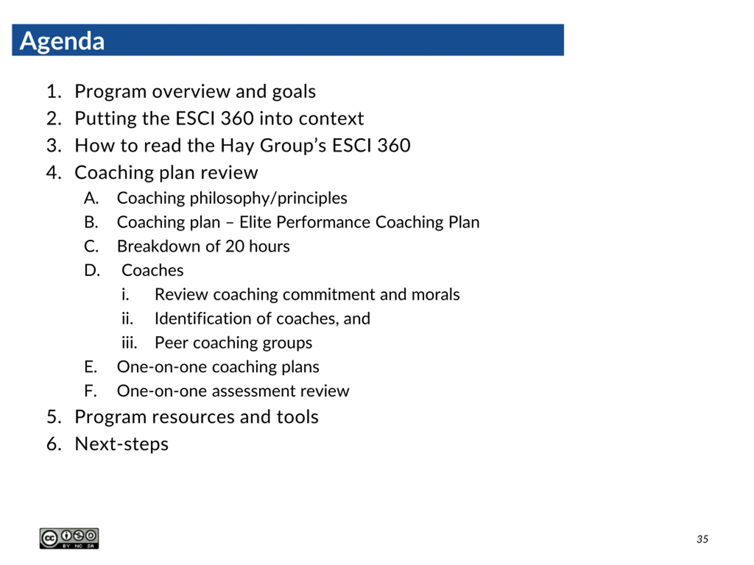 Agenda 1. Program overview and goals 2. Putting the ESCI 360 into context 3. How to read the Hay Group s ESCI 360 4. Coaching plan review A. Coaching philosophy/principles B. Coaching plan Elite Performance Coaching Plan C. Breakdown of 20 hours D. Coaches i. Review coaching commitment and morals ii. Identification of coaches, and iii. Peer coaching groups E. One-on-one coaching plans F. One-on-one assessment review 5. Program resources and tools 6. Next-steps 35