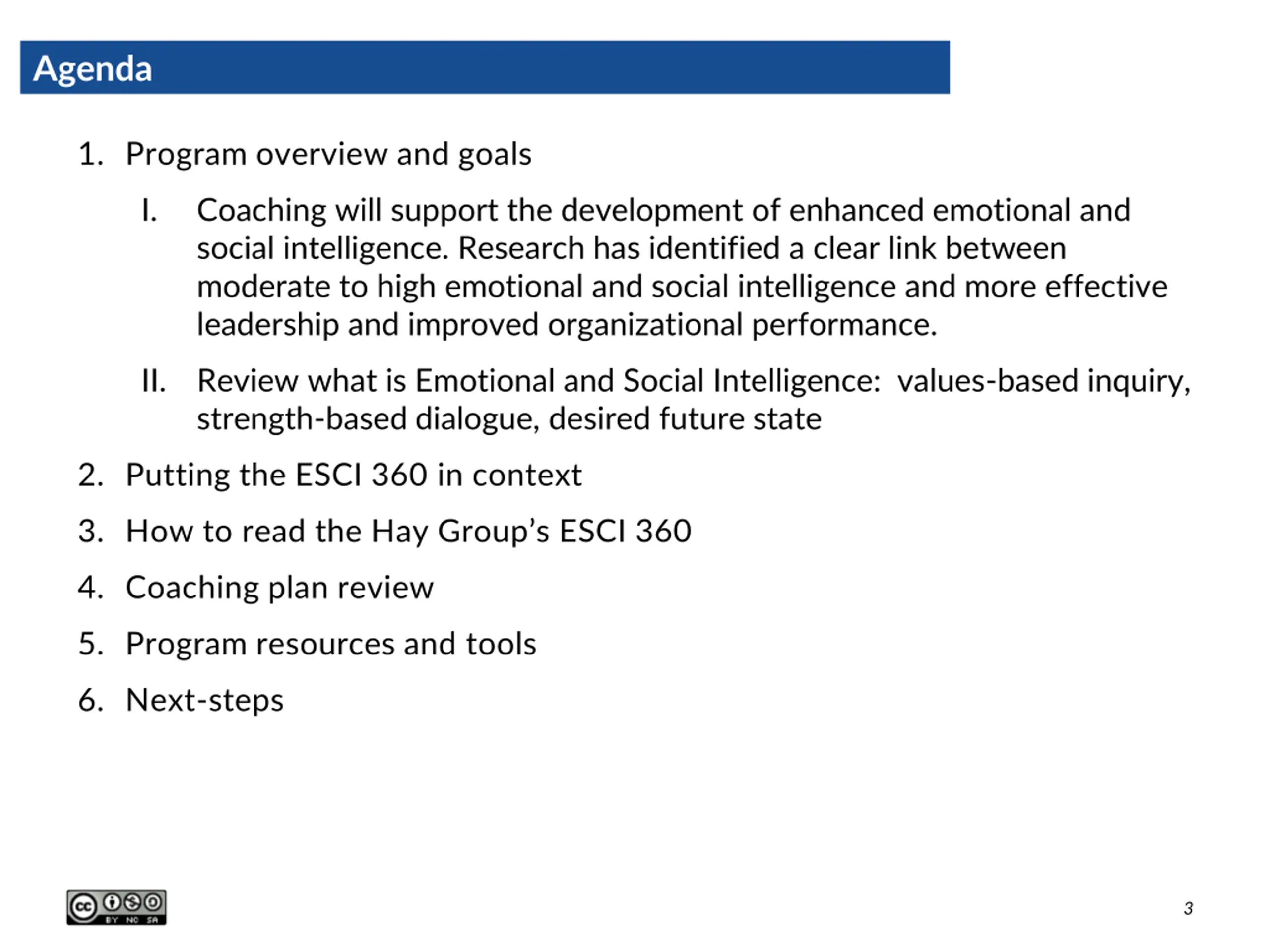 Agenda 1. Program overview and goals I. Coaching will support the development of enhanced emotional and social intelligence. Research has identified a clear link between moderate to high emotional and social intelligence and more effective leadership and improved organizational performance. II. Review what is Emotional and Social Intelligence: values-based inquiry, strength-based dialogue, desired future state 2. Putting the ESCI 360 in context 3. How to read the Hay Group s ESCI 360 4. Coaching plan review 5. Program resources and tools 6. Next-steps 3