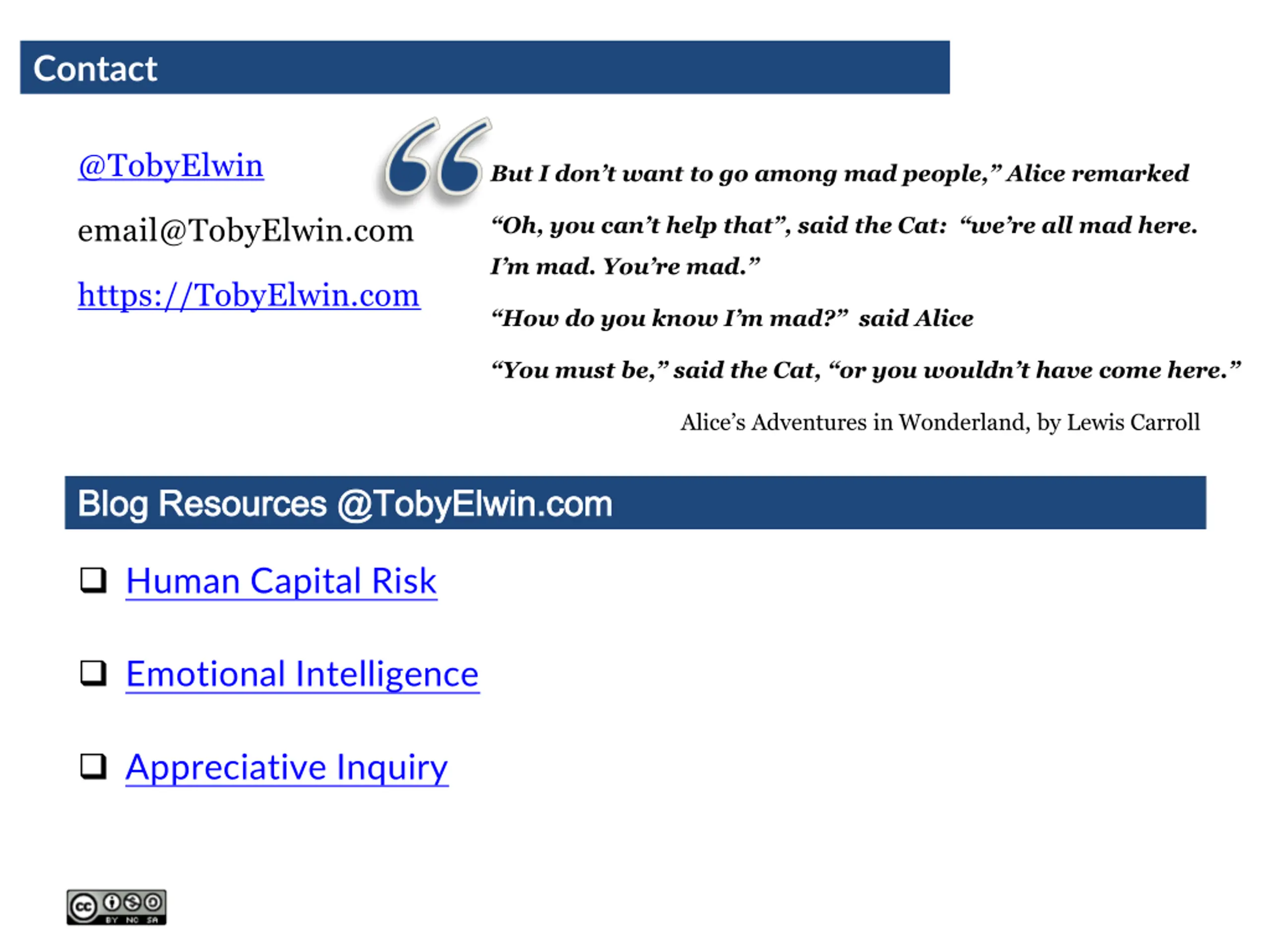 Contact @TobyElwin But I don t want to go among mad people, Alice remarked email@TobyElwin.com Oh, you can t help that , said the Cat: we re all mad here. I m mad. You re mad. https://TobyElwin.com How do you know I m mad? said Alice You must be, said the Cat, or you wouldn t have come here. Alice s Adventures in Wonderland, by Lewis Carroll Blog Resources @TobyElwin.com Blog Resources @TobyElwin.com Human Capital Risk Emotional Intelligence Appreciative Inquiry 44