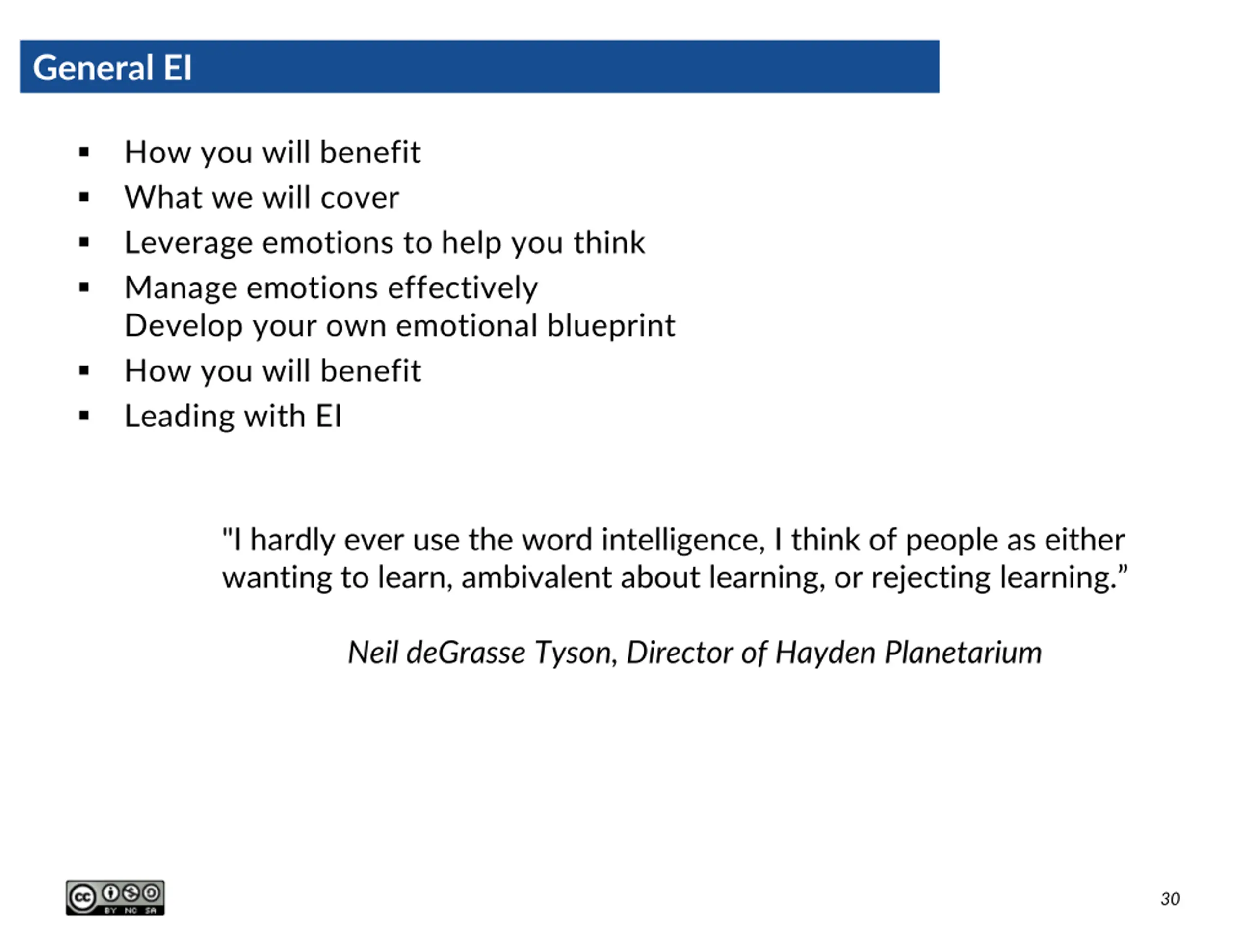 General EI How you will benefit What we will cover Leverage emotions to help you think Manage emotions effectively Develop your own emotional blueprint How you will benefit Leading with EI "I hardly ever use the word intelligence, I think of people as either wanting to learn, ambivalent about learning, or rejecting learning. Neil deGrasse Tyson, Director of Hayden Planetarium 30
