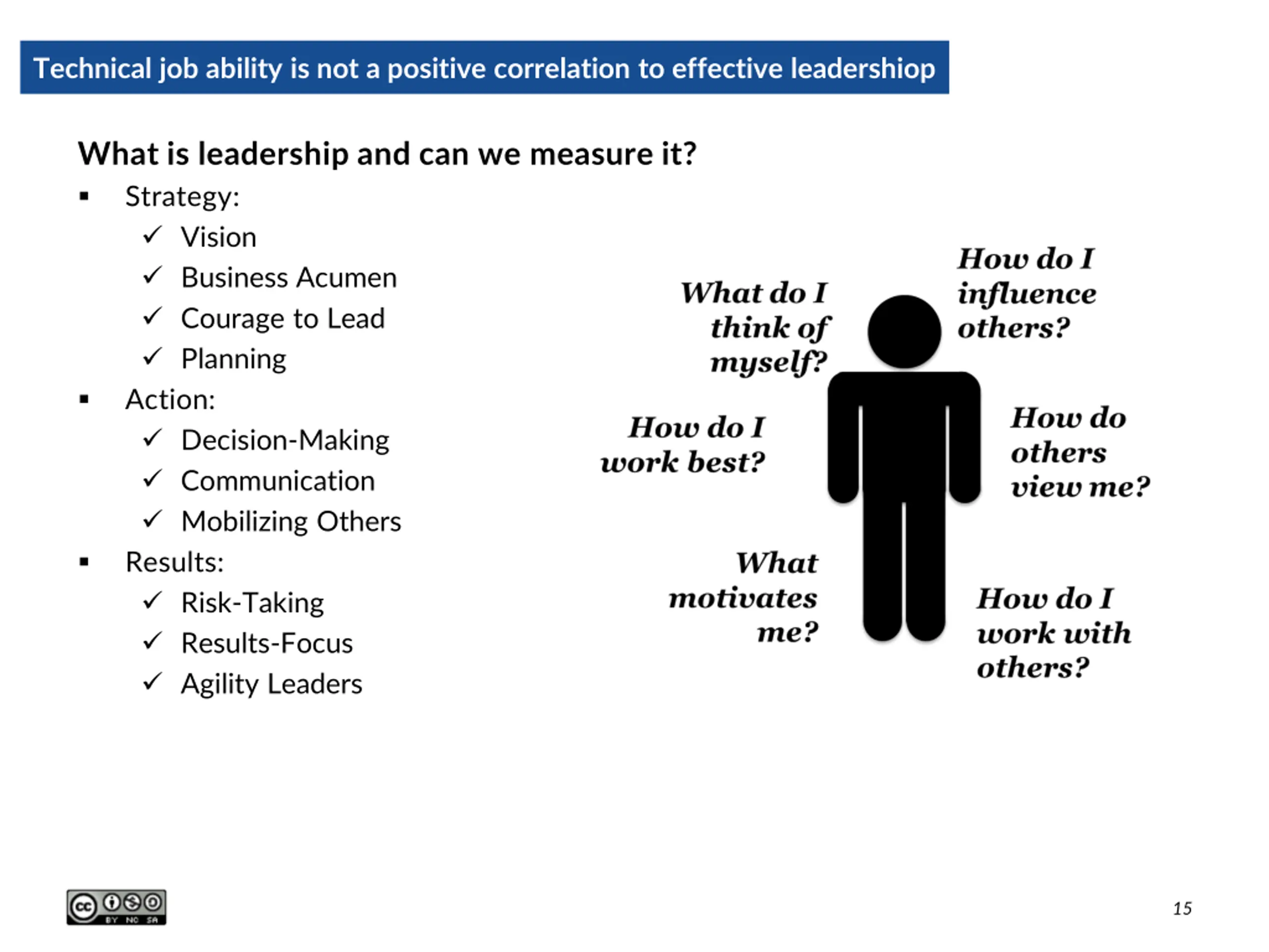Technical job ability is not a positive correlation to effective leadershiop What is leadership and can we measure it? Strategy: Vision Business Acumen Courage to Lead Planning Action: Decision-Making Communication Mobilizing Others Results: Risk-Taking Results-Focus Agility Leaders 15