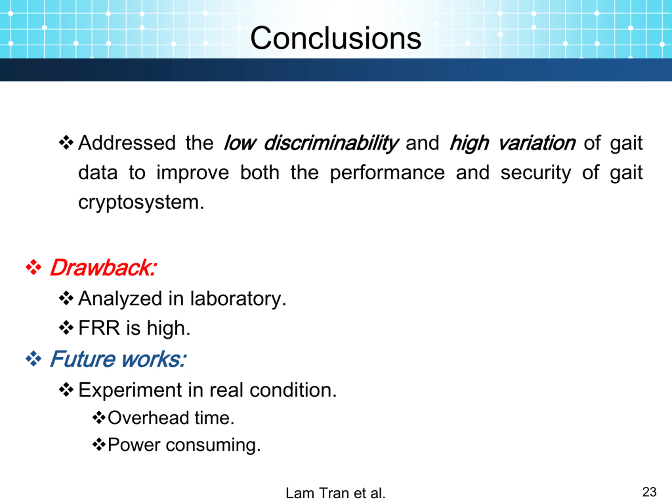Conclusions Addressed the low data to improve both the performance and security of gait cryptosystem. low discriminability discriminability and high high variation variation of gait Drawback Drawback: : Analyzed in laboratory. FRR is high. Future Future works works: : Experiment in real condition. Overhead time. Power consuming. Lam Tran et al. 23