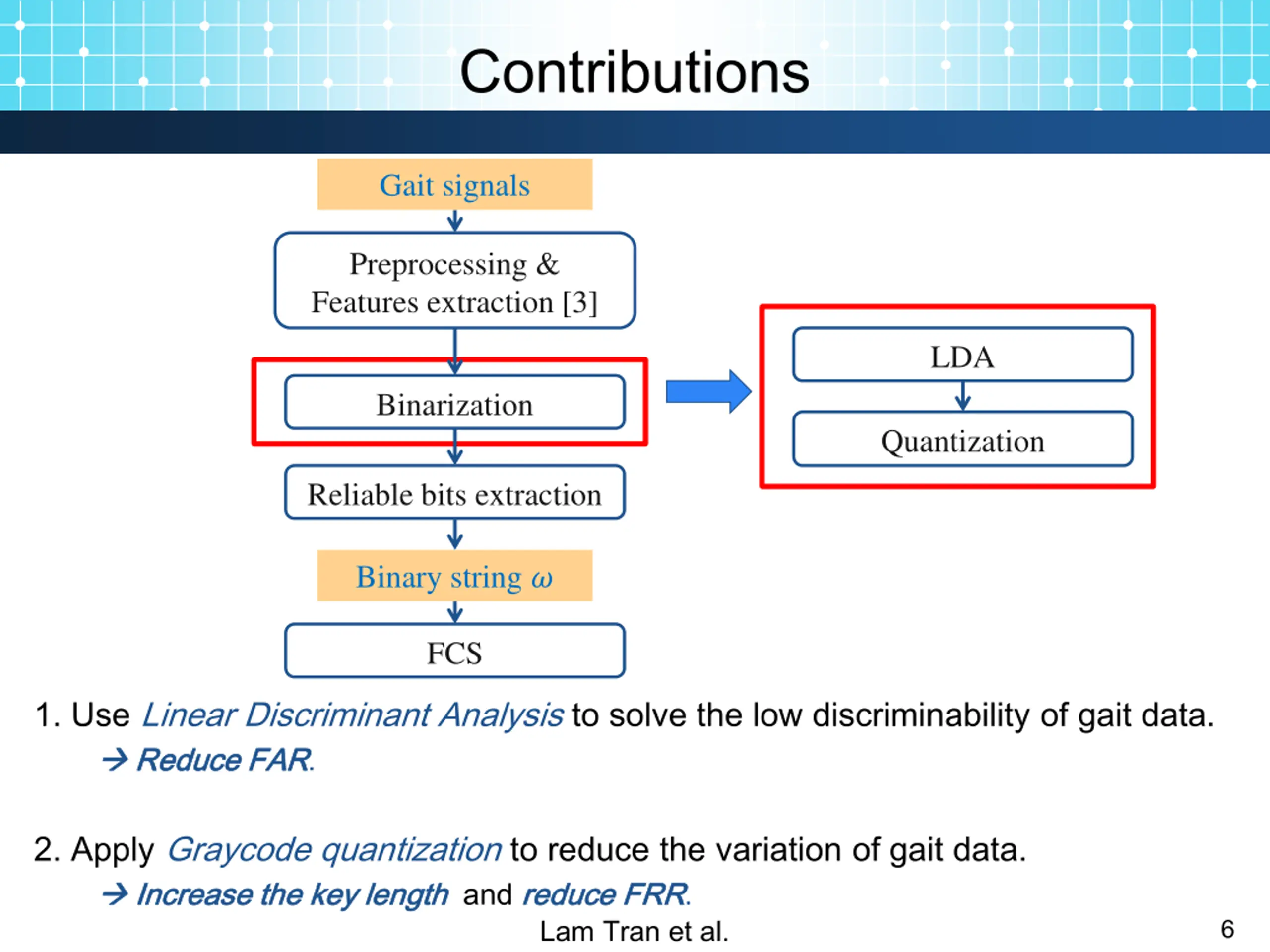 Contributions Gait signals Preprocessing & Features extraction [3] LDA Binarization Quantization Reliable bits extraction Binary string ? FCS 1. Use Linear Discriminant Analysis to solve the low discriminability of gait data. R Reduce educe FAR FAR. 2. Apply Graycode quantization to reduce the variation of gait data. Increase Increase the the key key length length and reduce reduce FRR FRR. Lam Tran et al. 6