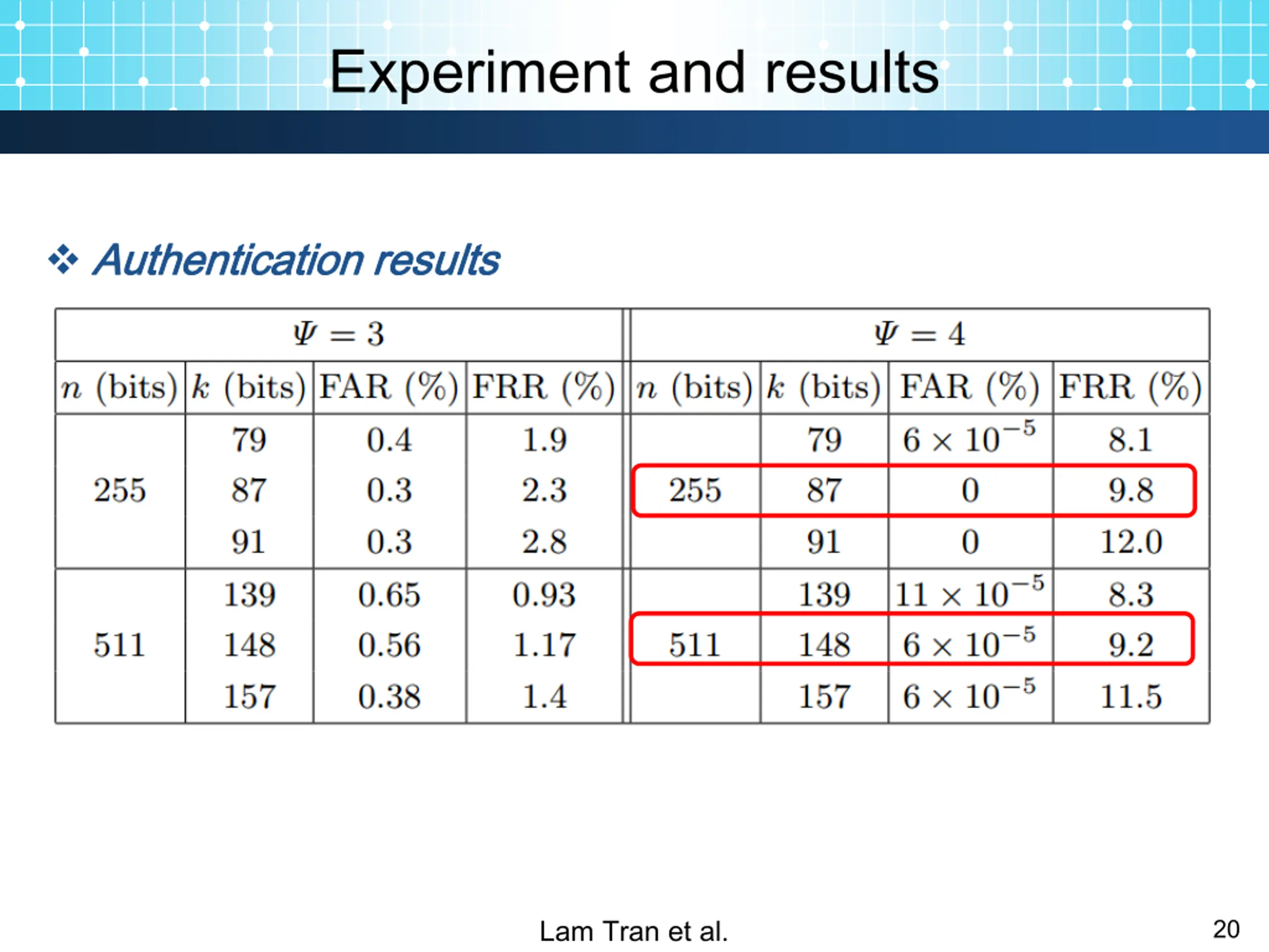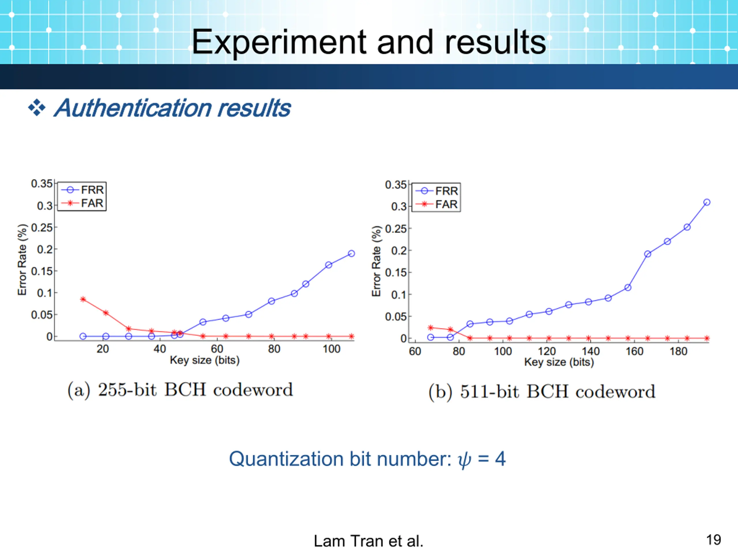 Experiment and results Authentication Authentication results results Quantization bit number: ? = 4 Lam Tran et al. 19