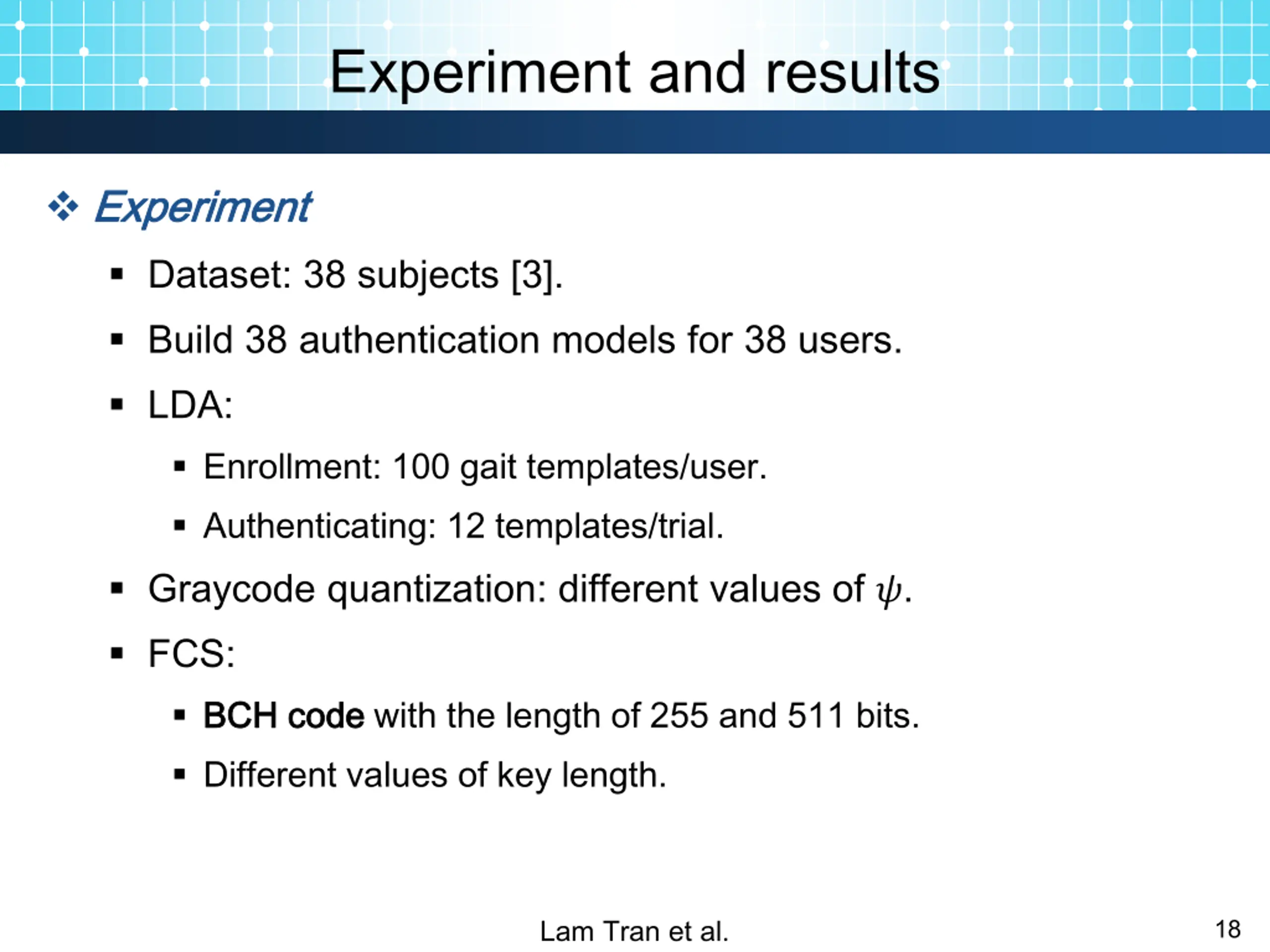 Experiment and results Experiment Experiment Dataset: 38 subjects [3]. Build 38 authentication models for 38 users. LDA: Enrollment: 100 gait templates/user. Authenticating: 12 templates/trial. Graycode quantization: different values of ?. FCS: BCH BCH code code with the length of 255 and 511 bits. Different values of key length. Lam Tran et al. 18