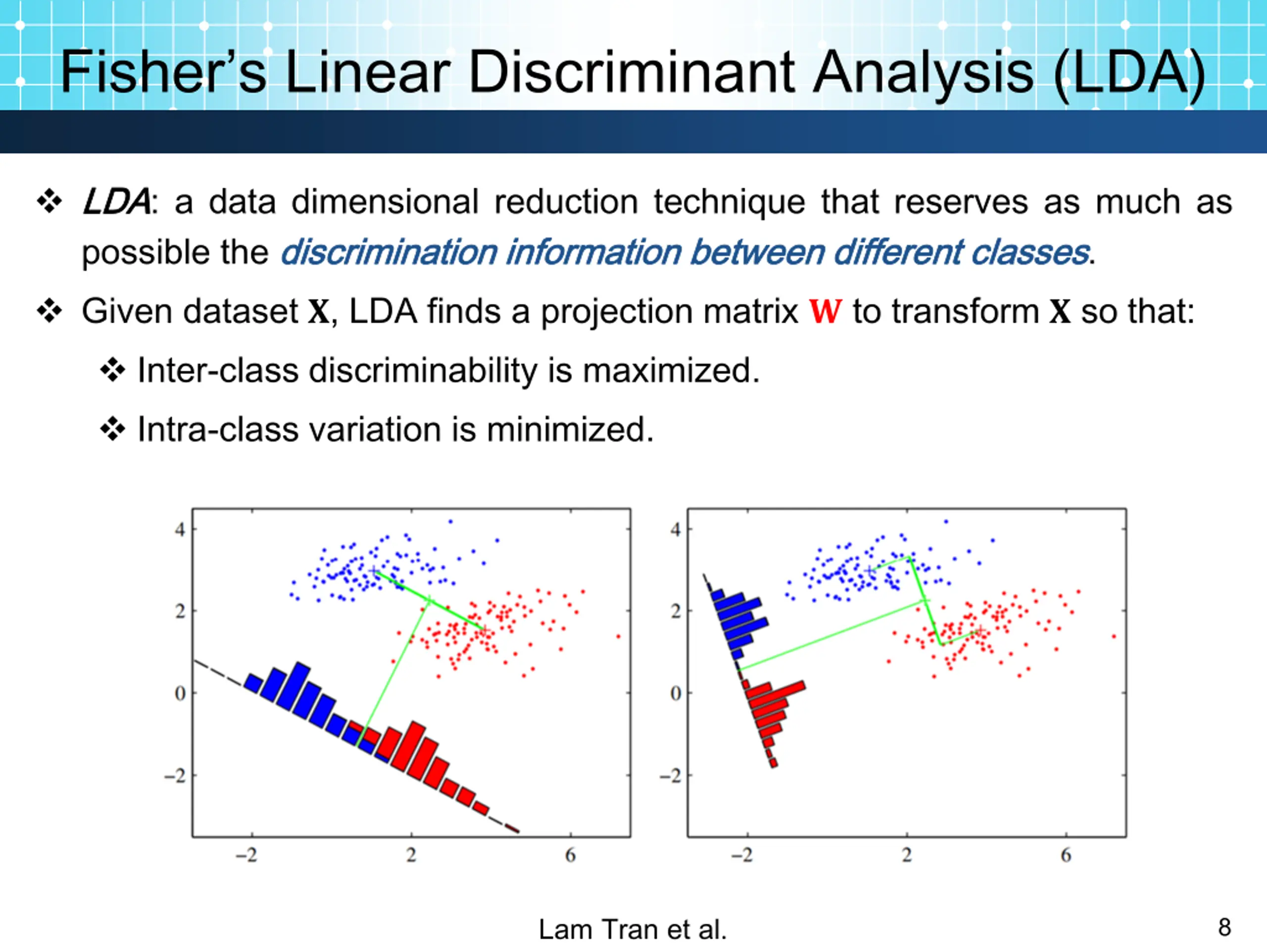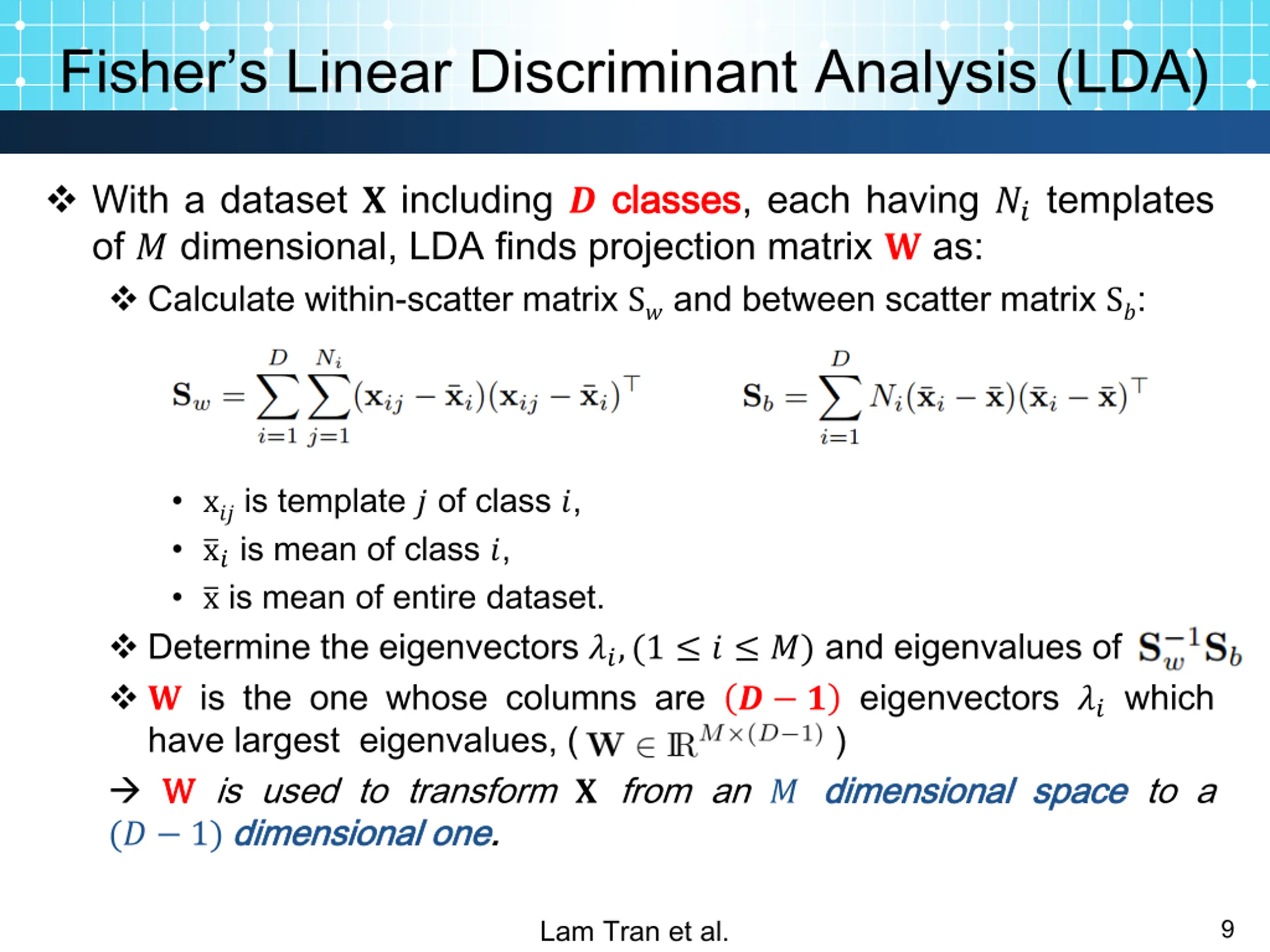 Fishers Linear Discriminant Analysis (LDA) LDA LDA: a data dimensional reduction technique that reserves as much as possible the discrimination discrimination information information between Given dataset ?, LDA finds a projection matrix ? to transform ? so that: Inter-class discriminability is maximized. Intra-class variation is minimized. between different different classes classes. Lam Tran et al. 8