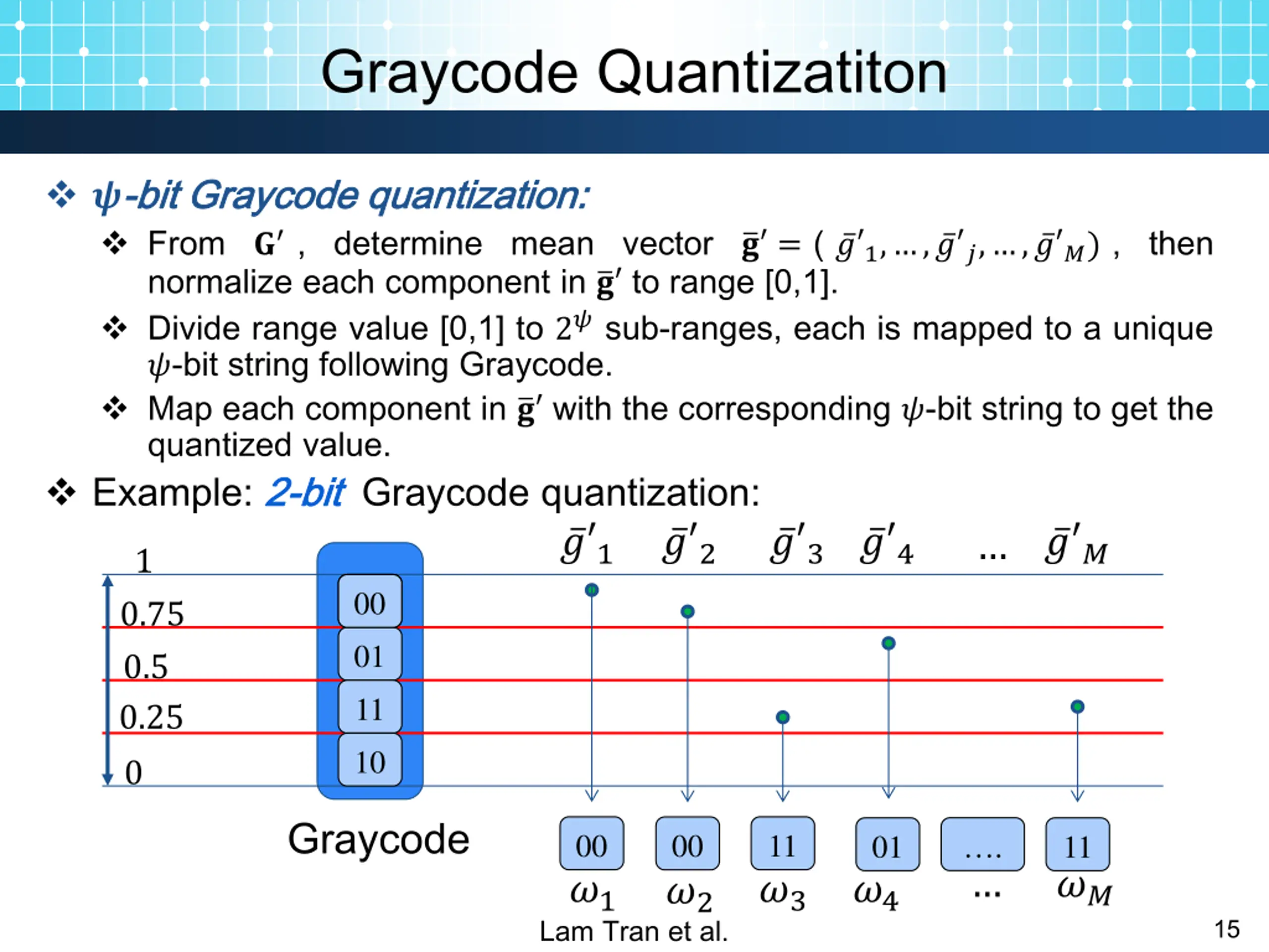Graycode Quantizatiton ?- -bit From ? , determine mean vector ? = ( normalize each component in ? to range [0,1]. Divide range value [0,1] to 2? sub-ranges, each is mapped to a unique ?-bit string following Graycode. Map each component in ? with the corresponding ?-bit string to get the quantized value. Example: 2 2- -bit bit Graycode quantization: ? 1 00 bit Graycode Graycode quantization quantization: : ? 1, , ? ?, , ? ?) , then ? 2 ? 3 ? 4 ? ? 1 00 0.75 01 0.5 11 0.25 10 0 Graycode 00 11 00 01 11 . ?? ?1 ?3 ?4 ?2 Lam Tran et al. 15