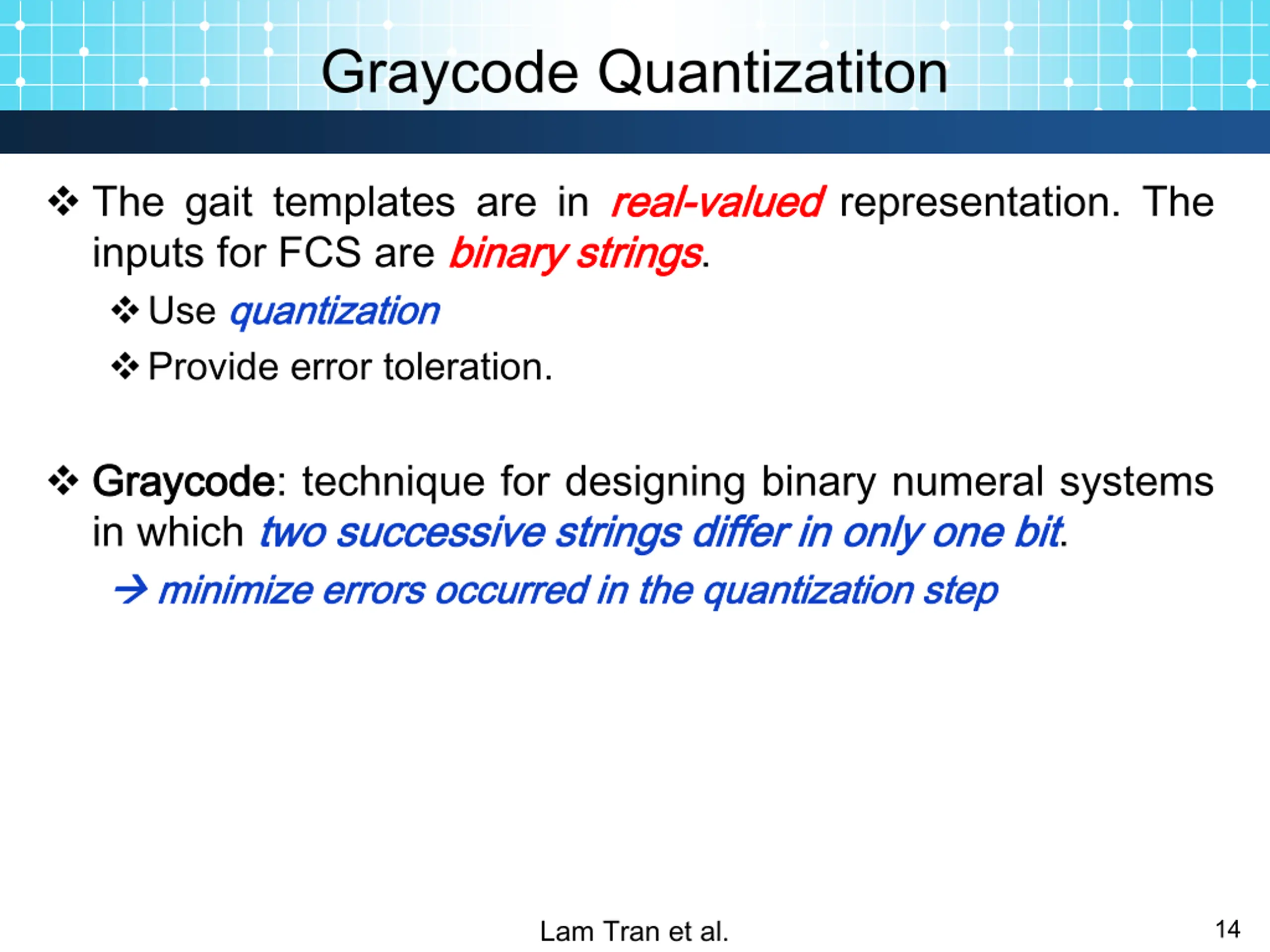 Graycode Quantizatiton The gait templates are in real inputs for FCS are binary Use quantization quantization Provide error toleration. real- -valued valued representation. The binary strings strings. Graycode Graycode: technique for designing binary numeral systems in which two two successive successive strings strings differ minimize minimize errors errors occurred occurred in in the the quantization differ in in only quantization step only one one bit step bit. Lam Tran et al. 14