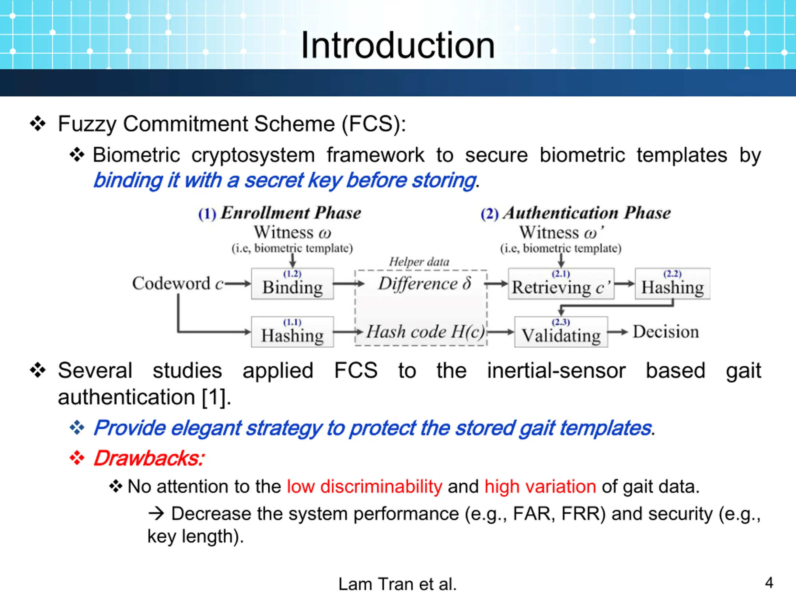 Introduction Fuzzy Commitment Scheme (FCS): Biometric cryptosystem framework to secure biometric templates by binding binding it it with with a a secret secret key key before before storing storing. Several studies applied FCS to the inertial-sensor based gait authentication [1]. Provide Provide elegant elegant strategy strategy to to protect protect the Drawbacks Drawbacks: : No attention to the low discriminability and high variation of gait data. Decrease the system performance (e.g., FAR, FRR) and security (e.g., key length). the stored stored gait gait templates templates. Lam Tran et al. 4