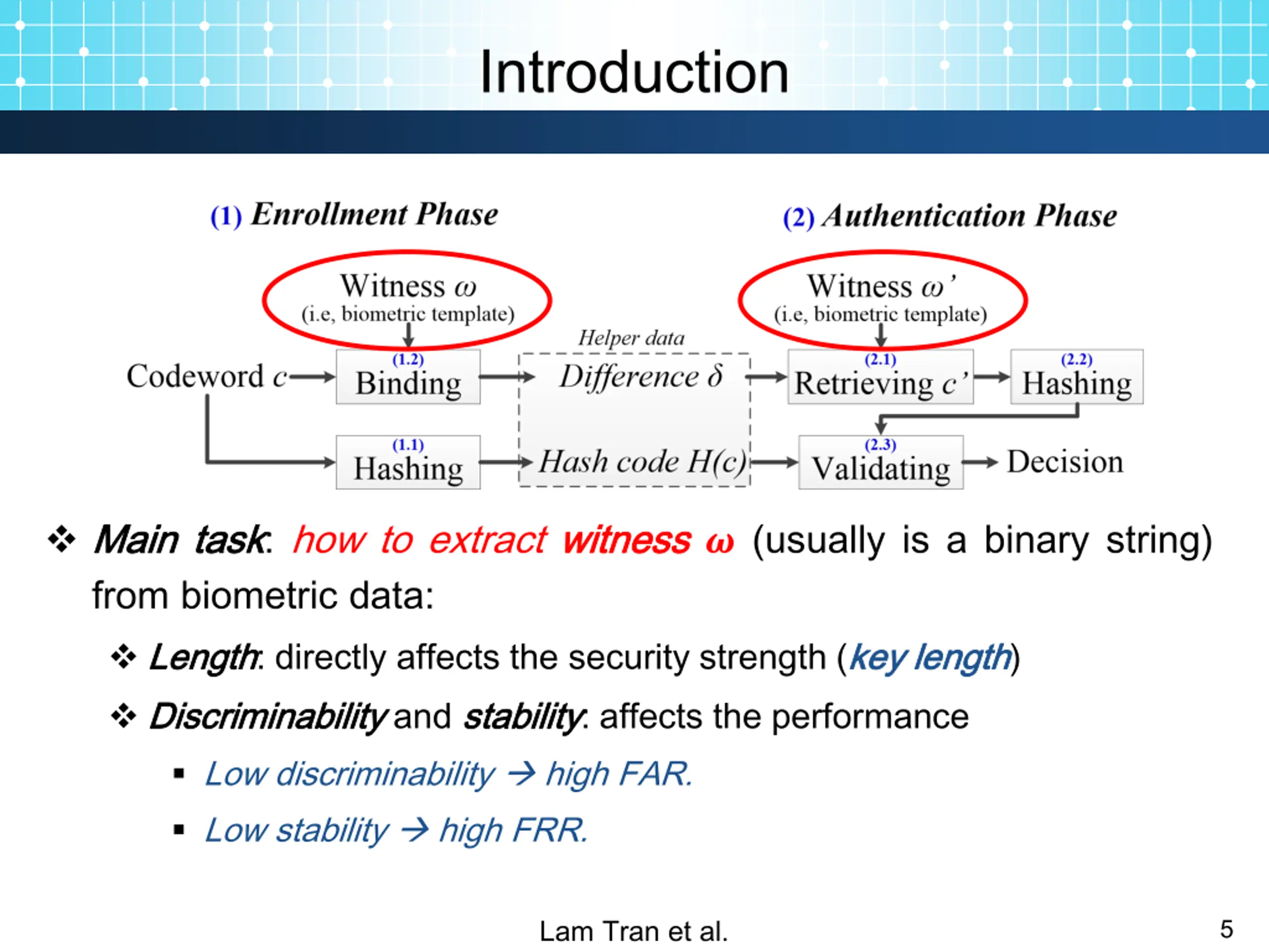 Introduction Main Main task from biometric data: Length Length: directly affects the security strength (key Discriminability Discriminability and stability stability: affects the performance Low discriminability high FAR. Low stability high FRR. task: how to extract witness witness ? (usually is a binary string) key length length) Lam Tran et al. 5