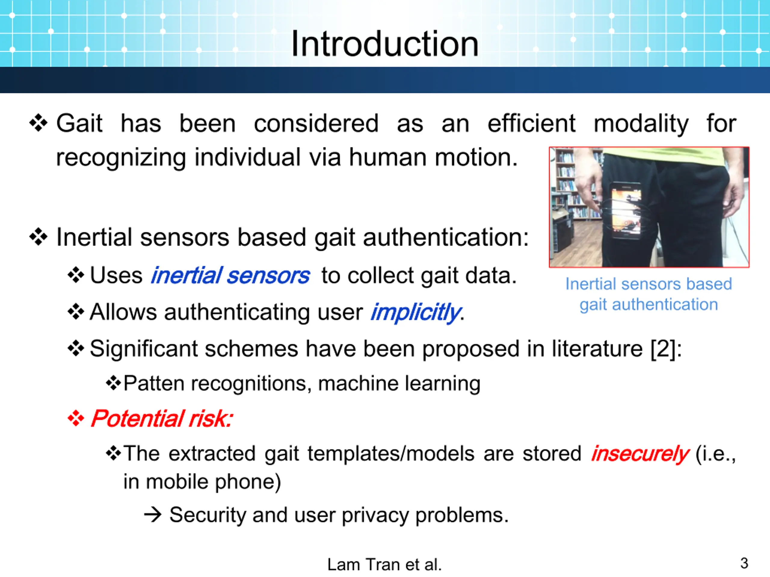 Introduction Gait has been considered as an efficient modality for recognizing individual via human motion. Inertial sensors based gait authentication: Uses inertial inertial sensors sensors to collect gait data. Allows authenticating user implicitly Significant schemes have been proposed in literature [2]: Patten recognitions, machine learning Potential Potential risk risk: : The extracted gait templates/models are stored insecurely in mobile phone) Security and user privacy problems. Inertial sensors based gait authentication implicitly. insecurely (i.e., Lam Tran et al. 3