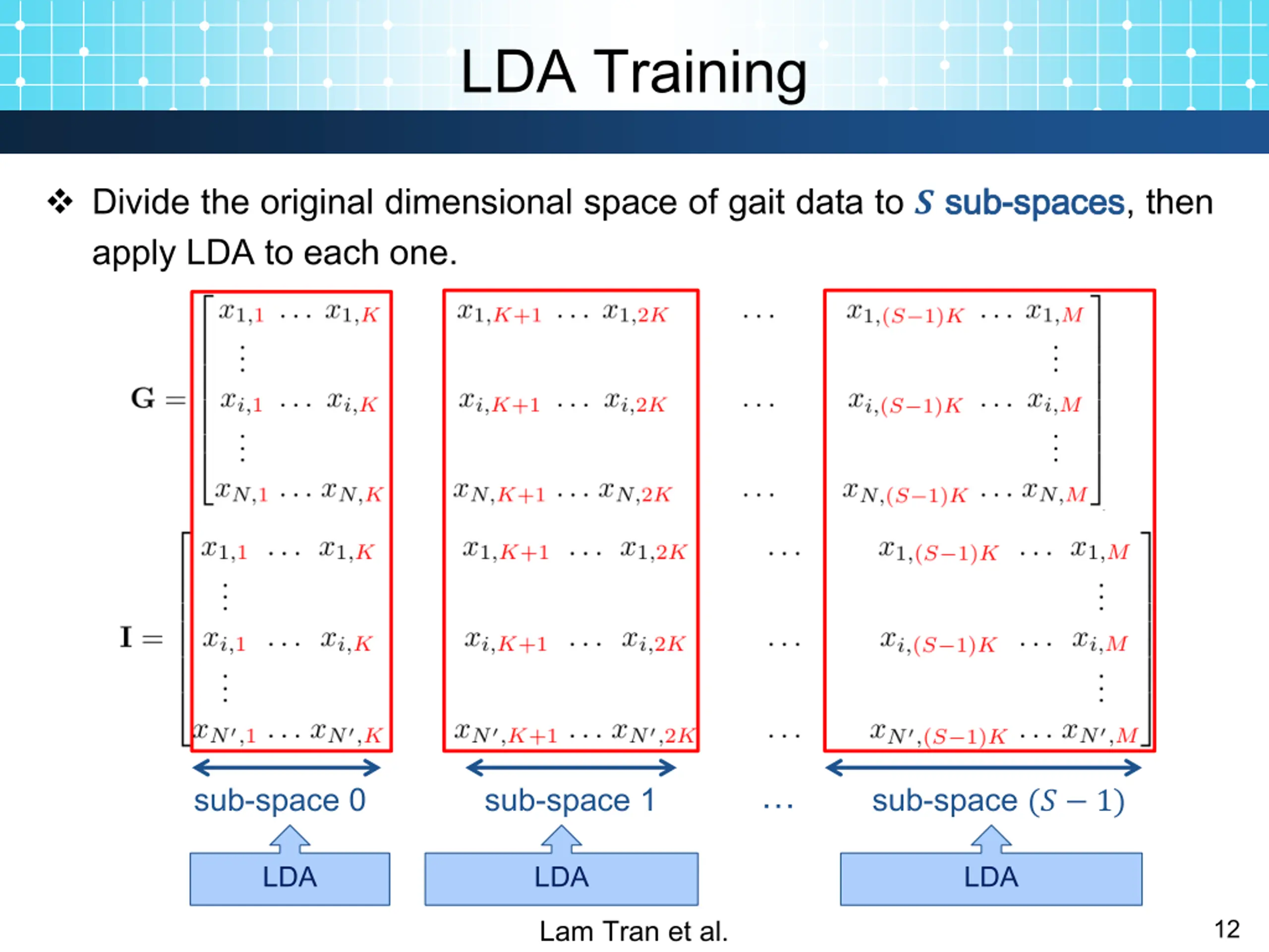 LDA Training Divide the original dimensional space of gait data to ? sub apply LDA to each one. sub- -spaces spaces, then sub-space 0 sub-space 1 sub-space (? 1) LDA LDA LDA Lam Tran et al. 12