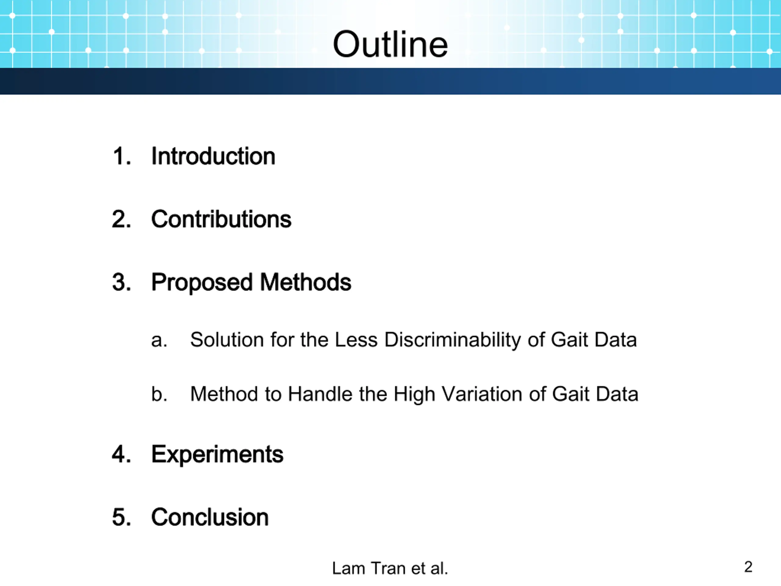 Outline 1. 1. Introduction Introduction 2. 2. Contributions Contributions 3. 3. Proposed Proposed Methods Methods a. Solution for the Less Discriminability of Gait Data b. Method to Handle the High Variation of Gait Data 4. 4. Experiments Experiments 5. 5. Conclusion Conclusion Lam Tran et al. 2