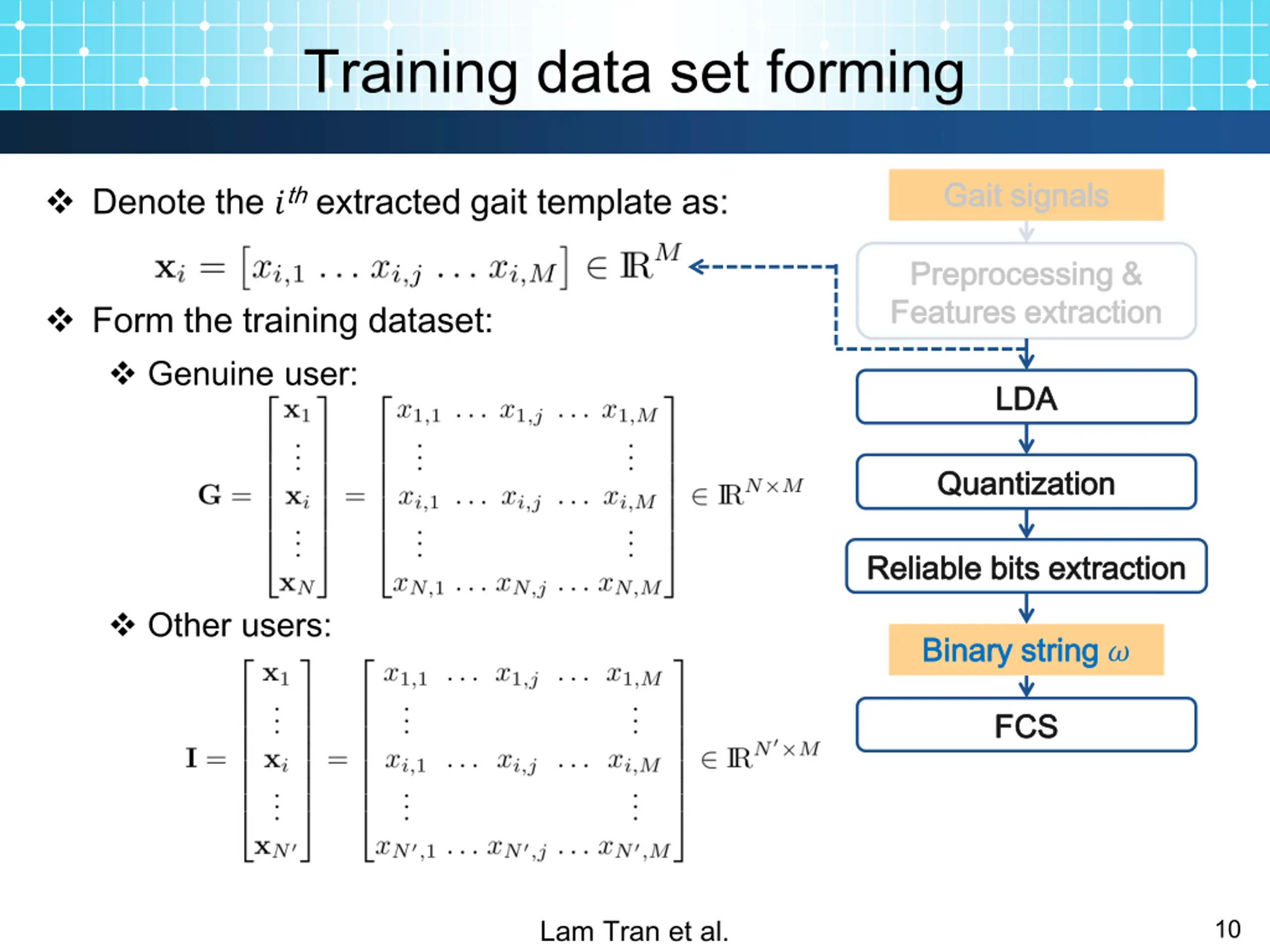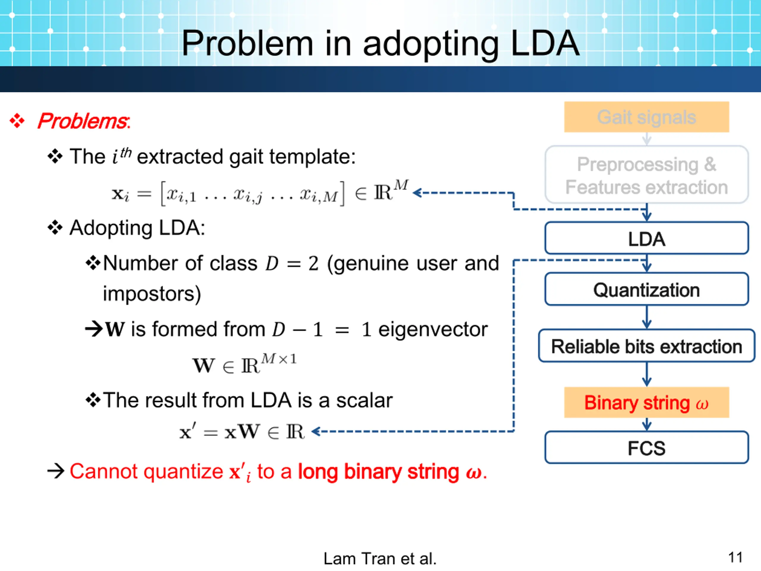 Training data set forming Gait signals Gait signals Denote the ?th extracted gait template as: Form the training dataset: Genuine user: Preprocessing Preprocessing & Features extraction Features extraction & LDA LDA Quantization Quantization Reliable Reliable bits extraction bits extraction Other users: Binary string Binary string ? FCS FCS Lam Tran et al. 10