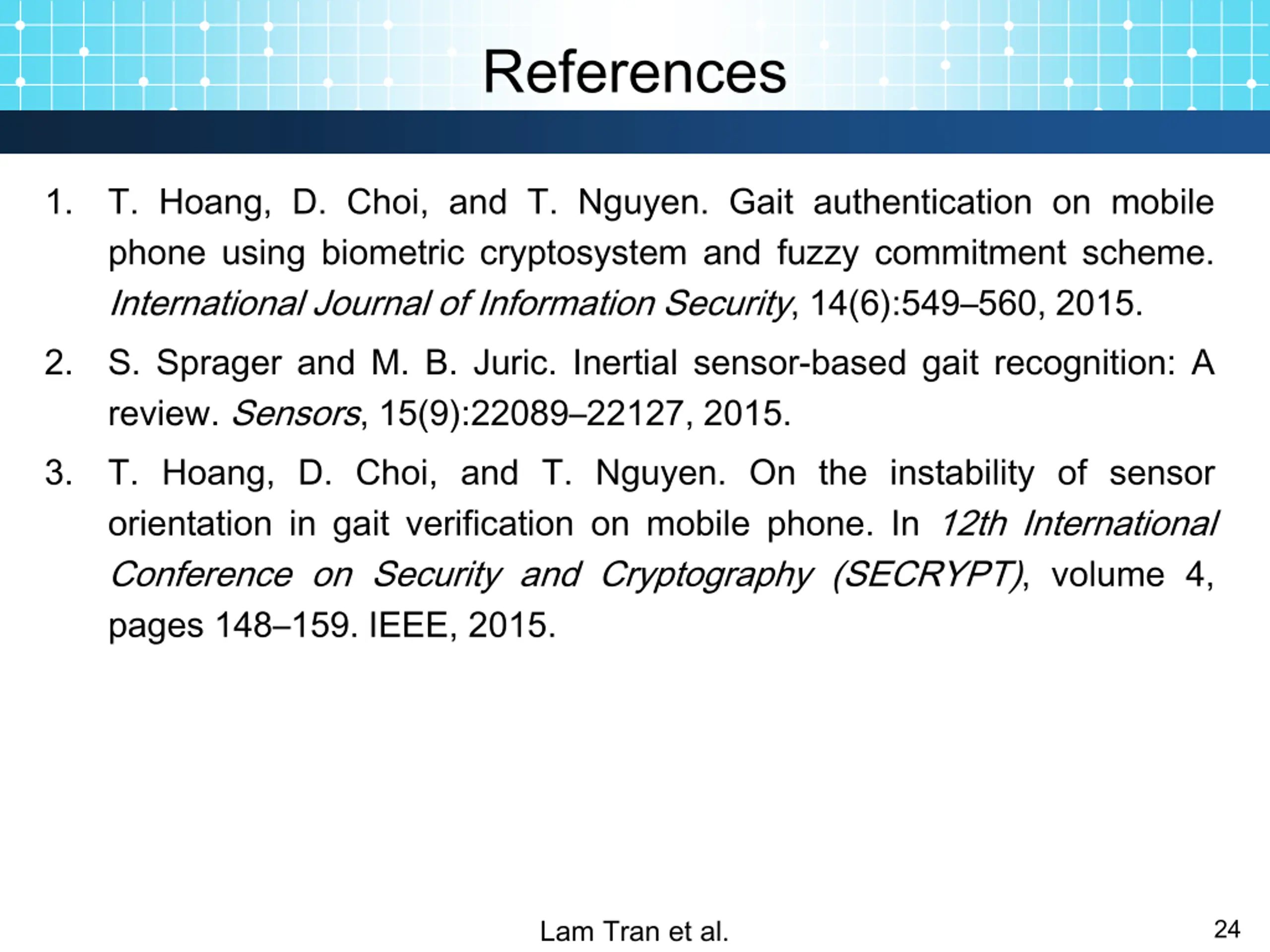 References 1. T. Hoang, D. Choi, and T. Nguyen. Gait authentication on mobile phone using biometric cryptosystem and fuzzy commitment scheme. International Journal of Information Security, 14(6):549 560, 2015. S. Sprager and M. B. Juric. Inertial sensor-based gait recognition: A review. Sensors, 15(9):22089 22127, 2015. T. Hoang, D. Choi, and T. Nguyen. On the instability of sensor orientation in gait verification on mobile phone. In 12th International Conference on Security and Cryptography (SECRYPT), volume 4, pages 148 159. IEEE, 2015. 2. 3. Lam Tran et al. 24