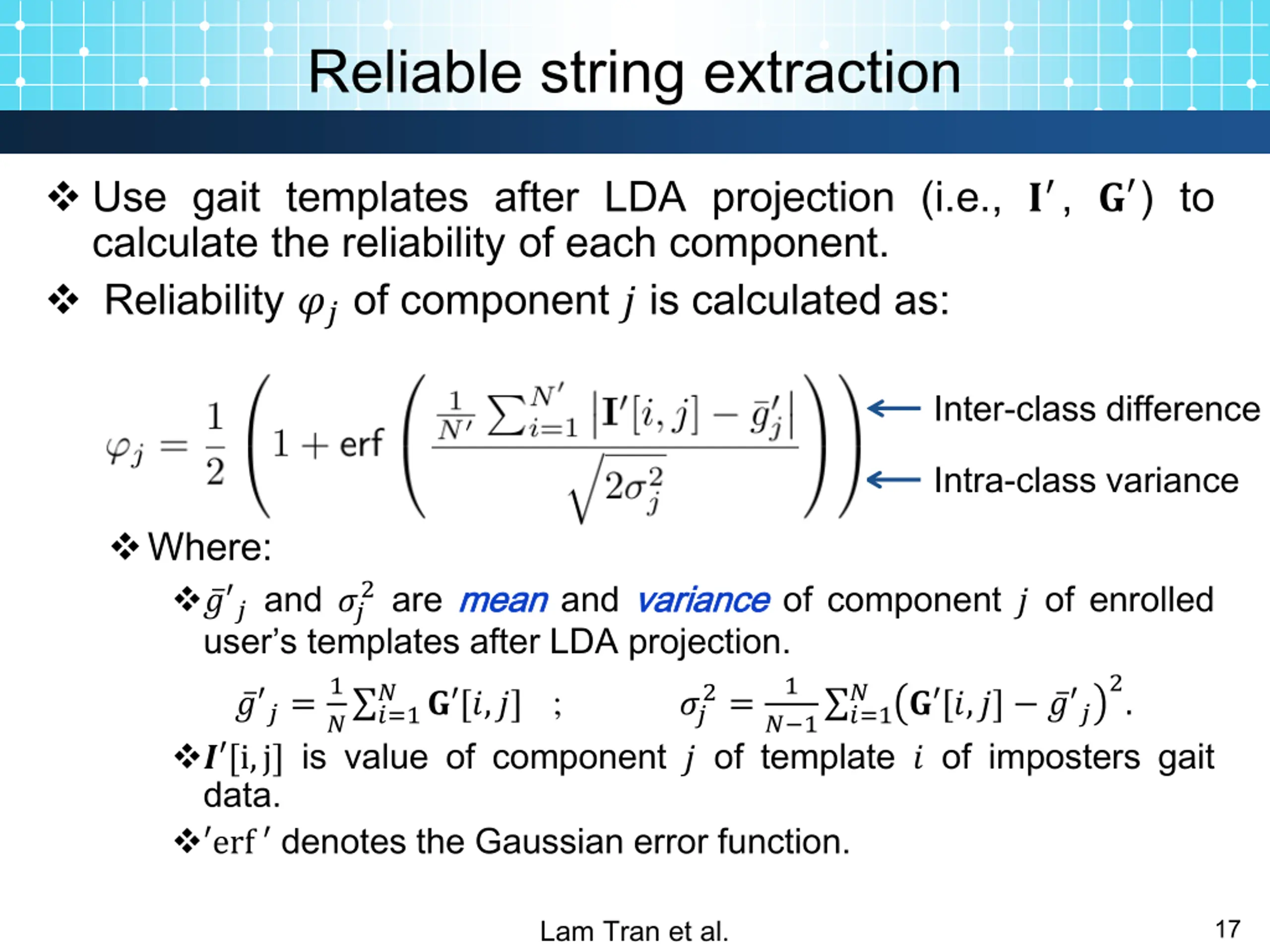 Reliable string extraction Use gait templates after LDA projection (i.e., ? ,? ) to calculate the reliability of each component. Reliability ?? of component ? is calculated as: Inter-class difference Intra-class variance Where: ? ? and ?? user s templates after LDA projection. 1 ? ?=1 ? [i,j] is value of component ? of template ? of imposters gait data. erf denotes the Gaussian error function. 2 are mean mean and variance variance of component ? of enrolled 2. 1 ? 2= ? ? [?,?] ; ? 1 ?=1 ? ?= ?? ? [?,?] ? ? Lam Tran et al. 17