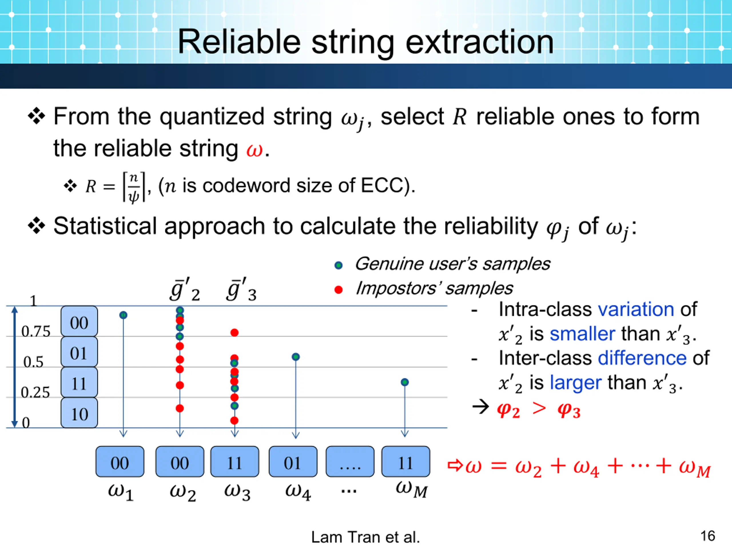 Reliable string extraction From the quantized string ??, select ? reliable ones to form the reliable string ?. ? ?, (? is codeword size of ECC). Statistical approach to calculate the reliability ?? of ??: ? = Genuine user s samples Impostors samples ? 2 ? 3 1 Intra-class variation of ? 2 is smaller than ? 3. Inter-class difference of ? 2 is larger than ? 3. ?? > ?? - 00 0.75 01 - 0.5 11 0.25 10 0 11 ?? 00 ?1 00 ?2 11 ?3 01 ?4 . ? = ?2+ ?4+ + ?? Lam Tran et al. 16