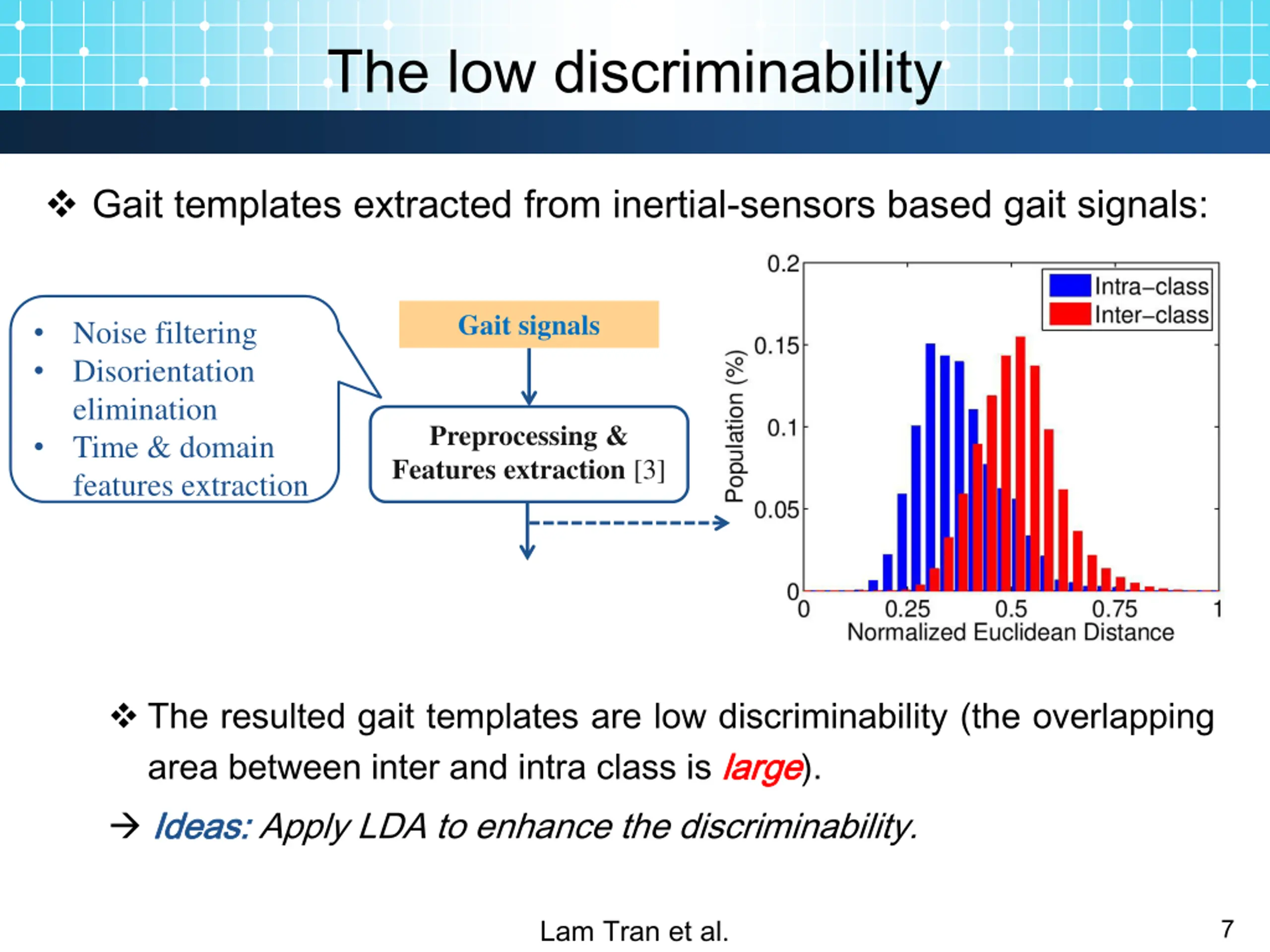 The low discriminability Gait templates extracted from inertial-sensors based gait signals: Gait signals Noise filtering Disorientation elimination Time & domain features extraction Preprocessing & Features extraction [3] The resulted gait templates are low discriminability (the overlapping area between inter and intra class is large Ideas Ideas: : Apply LDA to enhance the discriminability. large). Lam Tran et al. 7