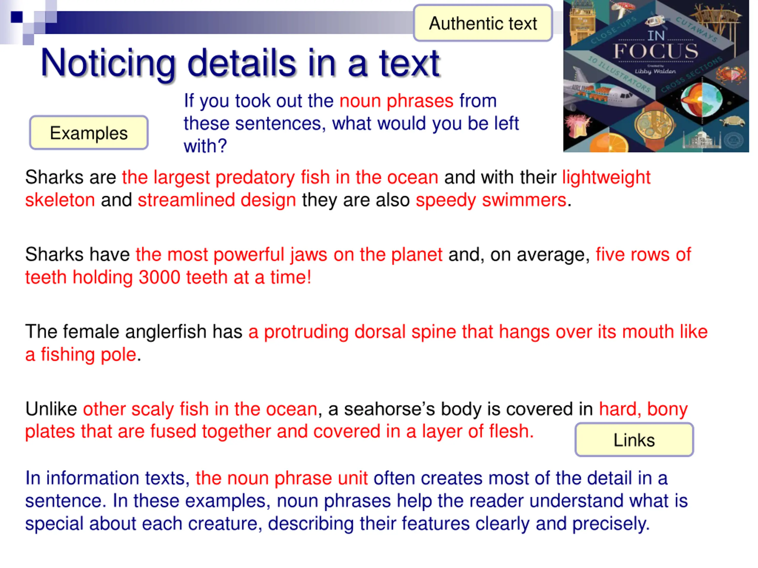Authentic text Noticing details in a text If you took out the noun phrases from these sentences, what would you be left with? Examples Sharks are the largest predatory fish in the ocean and with their lightweight skeleton and streamlined design they are also speedy swimmers. Sharks have the most powerful jaws on the planet and, on average, five rows of teeth holding 3000 teeth at a time! The female anglerfish has a protruding dorsal spine that hangs over its mouth like a fishing pole. Unlike other scaly fish in the ocean, a seahorse s body is covered in hard, bony plates that are fused together and covered in a layer of flesh. Links In information texts, the noun phrase unit often creates most of the detail in a sentence. In these examples, noun phrases help the reader understand what is special about each creature, describing their features clearly and precisely.