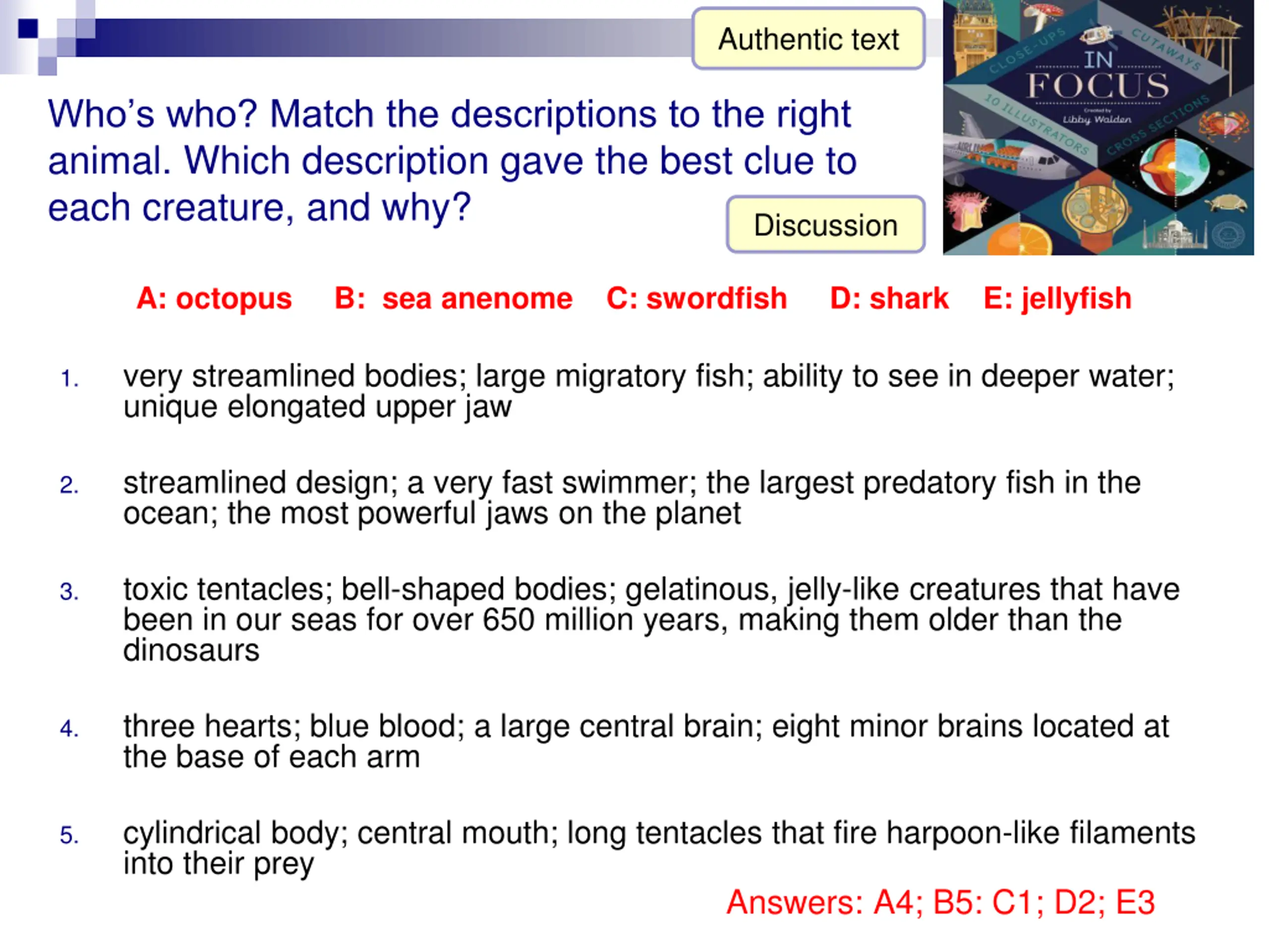Authentic text Who s who? Match the descriptions to the right animal. Which description gave the best clue to each creature, and why? Discussion A: octopus B: sea anenome C: swordfish D: shark E: jellyfish very streamlined bodies; large migratory fish; ability to see in deeper water; unique elongated upper jaw 1. streamlined design; a very fast swimmer; the largest predatory fish in the ocean; the most powerful jaws on the planet 2. toxic tentacles; bell-shaped bodies; gelatinous, jelly-like creatures that have been in our seas for over 650 million years, making them older than the dinosaurs 3. three hearts; blue blood; a large central brain; eight minor brains located at the base of each arm 4. cylindrical body; central mouth; long tentacles that fire harpoon-like filaments into their prey Answers: A4; B5: C1; D2; E3 5.