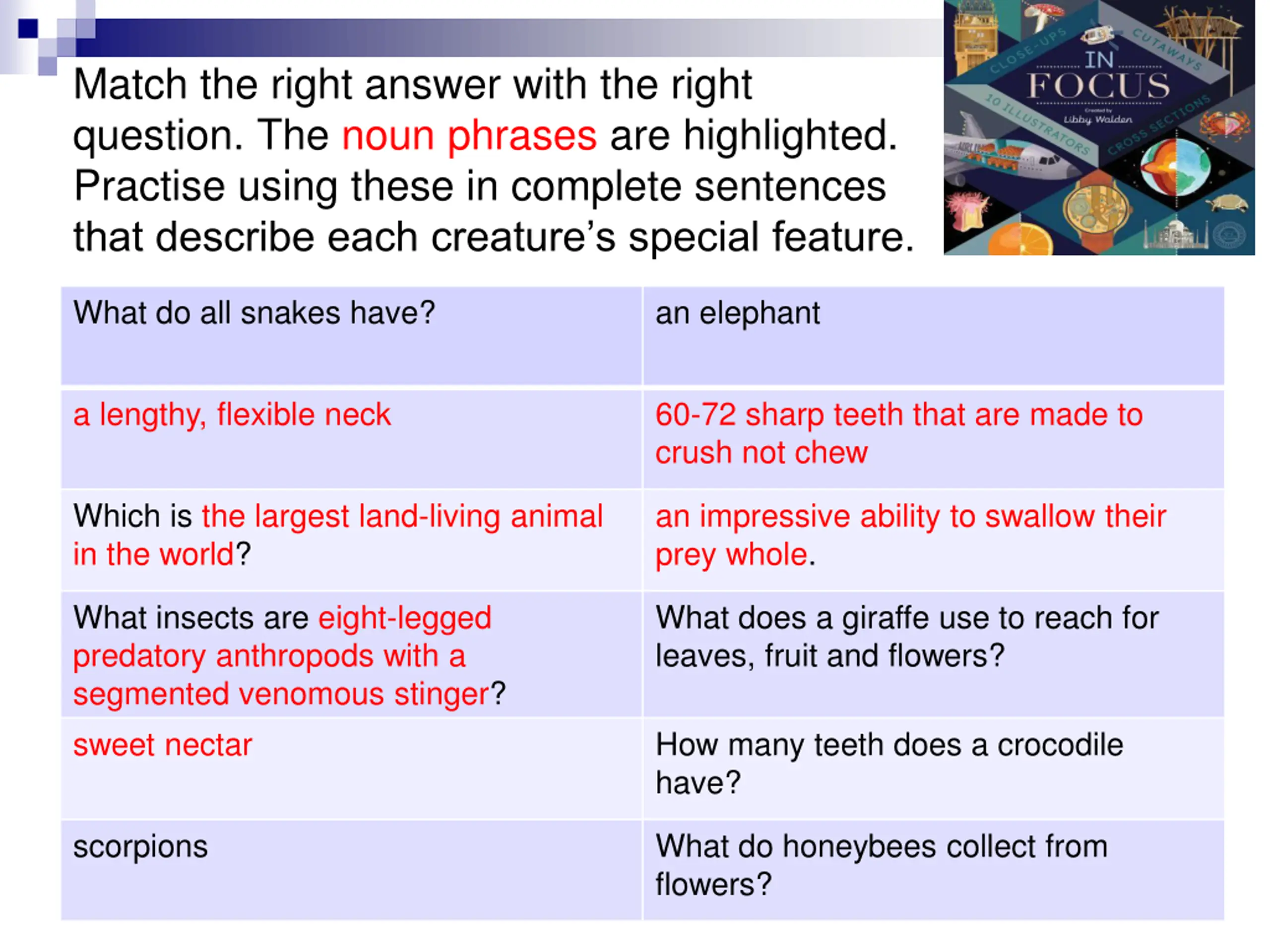Match the right answer with the right question. The noun phrases are highlighted. Practise using these in complete sentences that describe each creature s special feature. What do all snakes have? an elephant a lengthy, flexible neck 60-72 sharp teeth that are made to crush not chew Which is the largest land-living animal in the world? an impressive ability to swallow their prey whole. What insects are eight-legged predatory anthropods with a segmented venomous stinger? sweet nectar What does a giraffe use to reach for leaves, fruit and flowers? How many teeth does a crocodile have? scorpions What do honeybees collect from flowers?