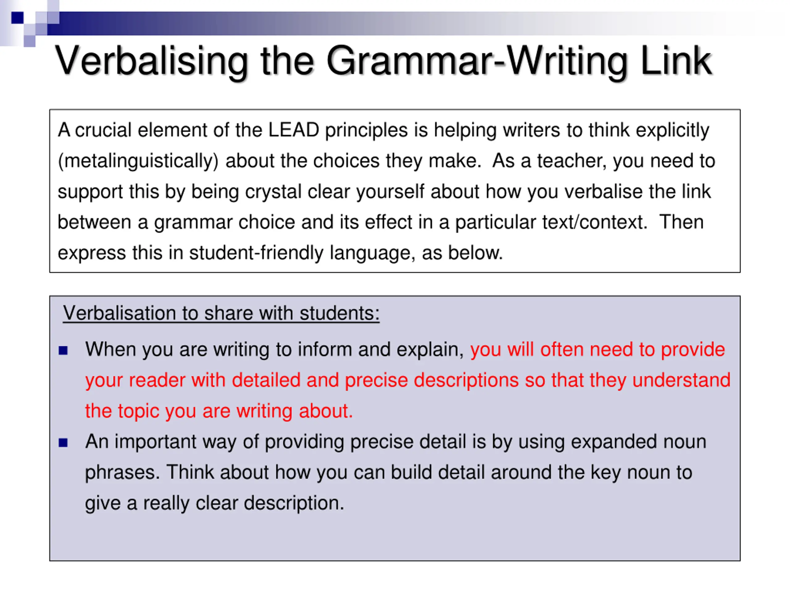 Verbalising the Grammar-Writing Link A crucial element of the LEAD principles is helping writers to think explicitly (metalinguistically) about the choices they make. As a teacher, you need to support this by being crystal clear yourself about how you verbalise the link between a grammar choice and its effect in a particular text/context. Then express this in student-friendly language, as below. Verbalisation to share with students: When you are writing to inform and explain, you will often need to provide your reader with detailed and precise descriptions so that they understand the topic you are writing about. An important way of providing precise detail is by using expanded noun phrases. Think about how you can build detail around the key noun to give a really clear description.