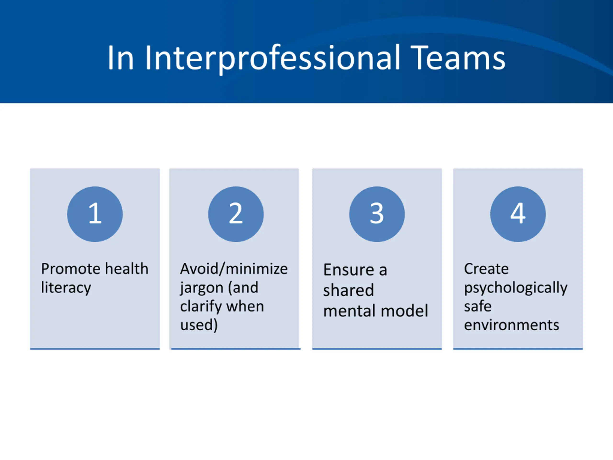 In Interprofessional Teams 1 2 3 4 Promote health literacy Avoid/minimize jargon (and clarify when used) Create psychologically safe environments Ensure a shared mental model