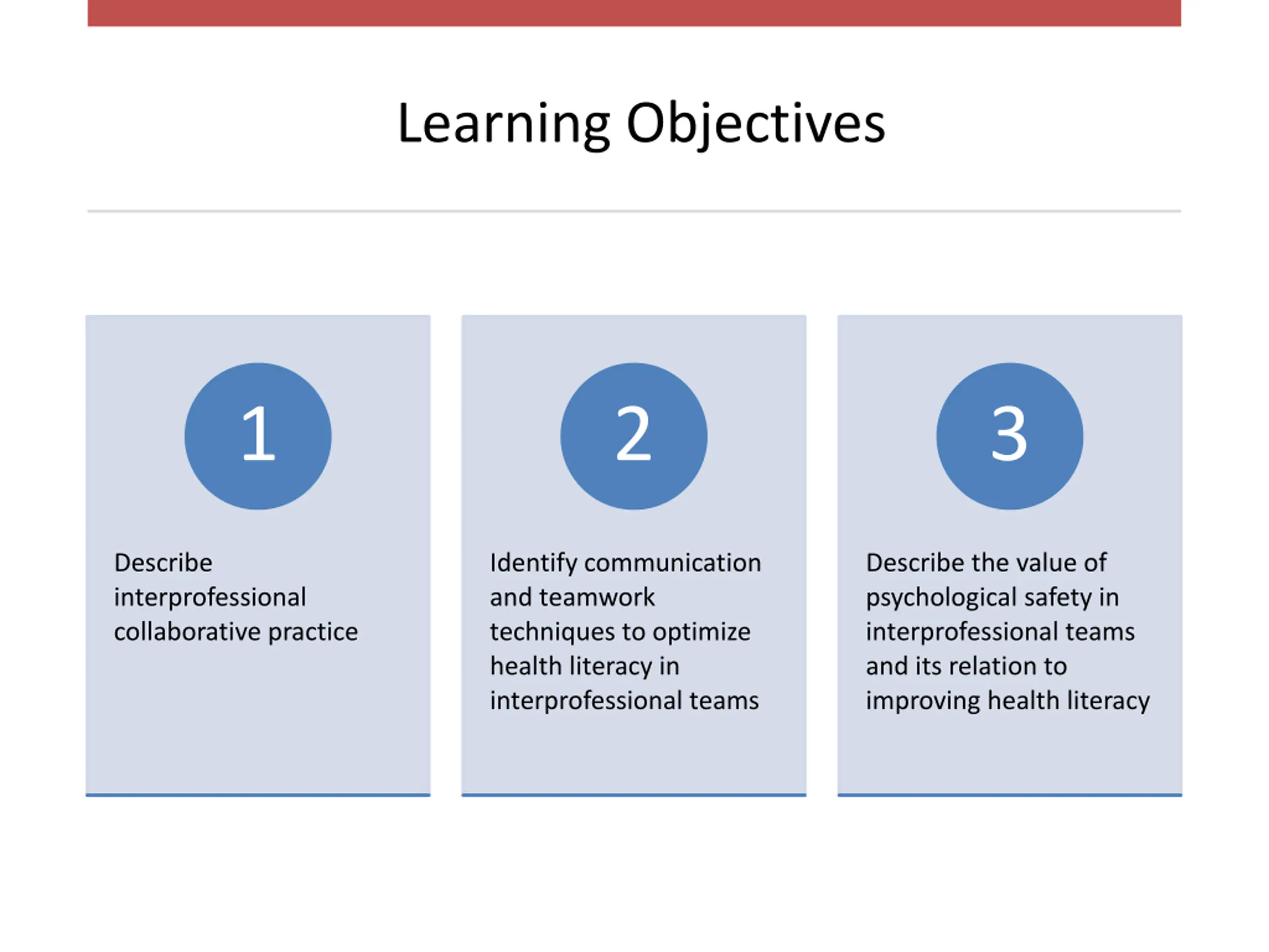 Learning Objectives 1 2 3 Describe interprofessional collaborative practice Identify communication and teamwork techniques to optimize health literacy in interprofessional teams Describe the value of psychological safety in interprofessional teams and its relation to improving health literacy