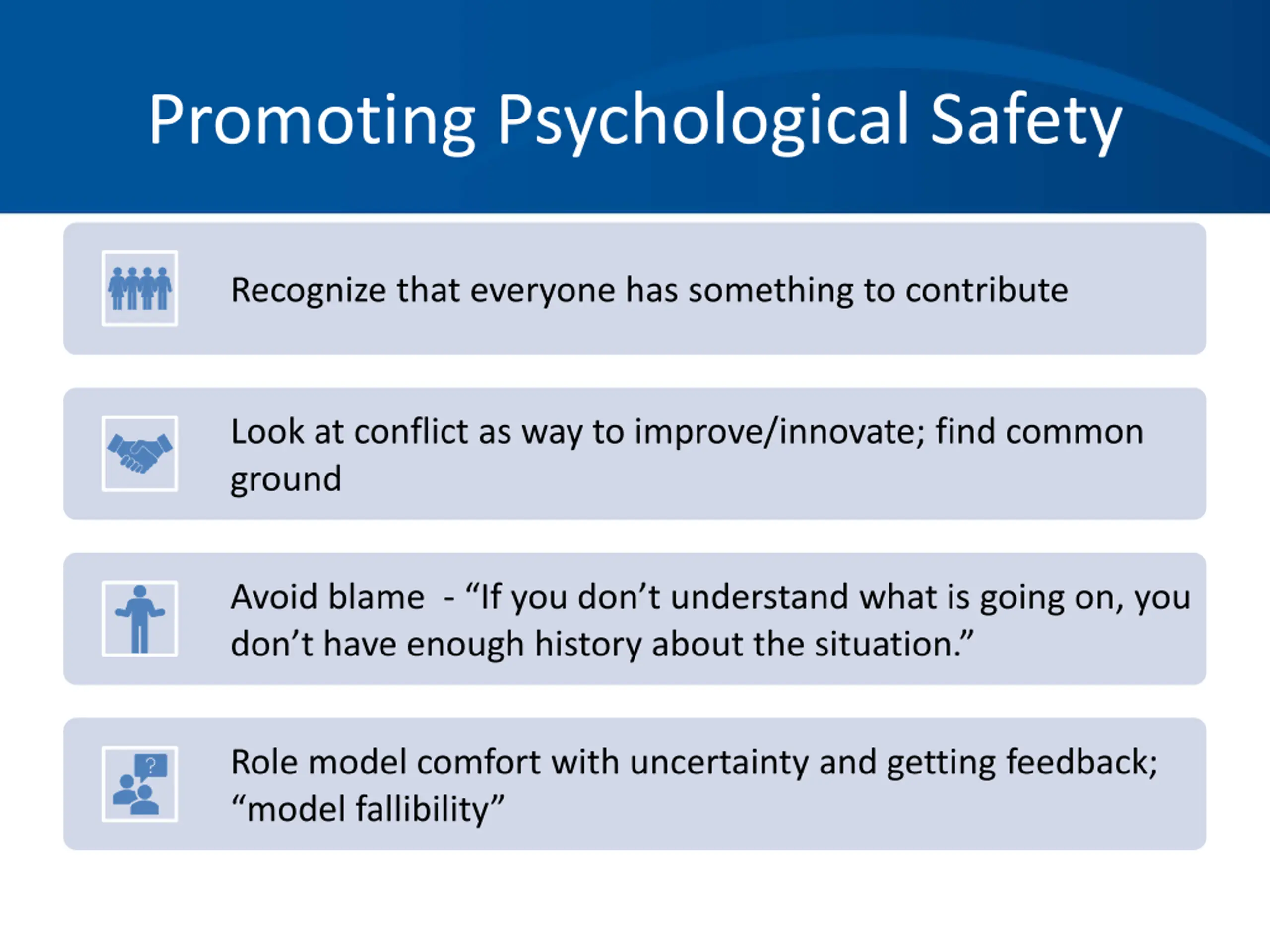 Promoting Psychological Safety Recognize that everyone has something to contribute Look at conflict as way to improve/innovate; find common ground Avoid blame - If you don t understand what is going on, you don t have enough history about the situation. Role model comfort with uncertainty and getting feedback; model fallibility