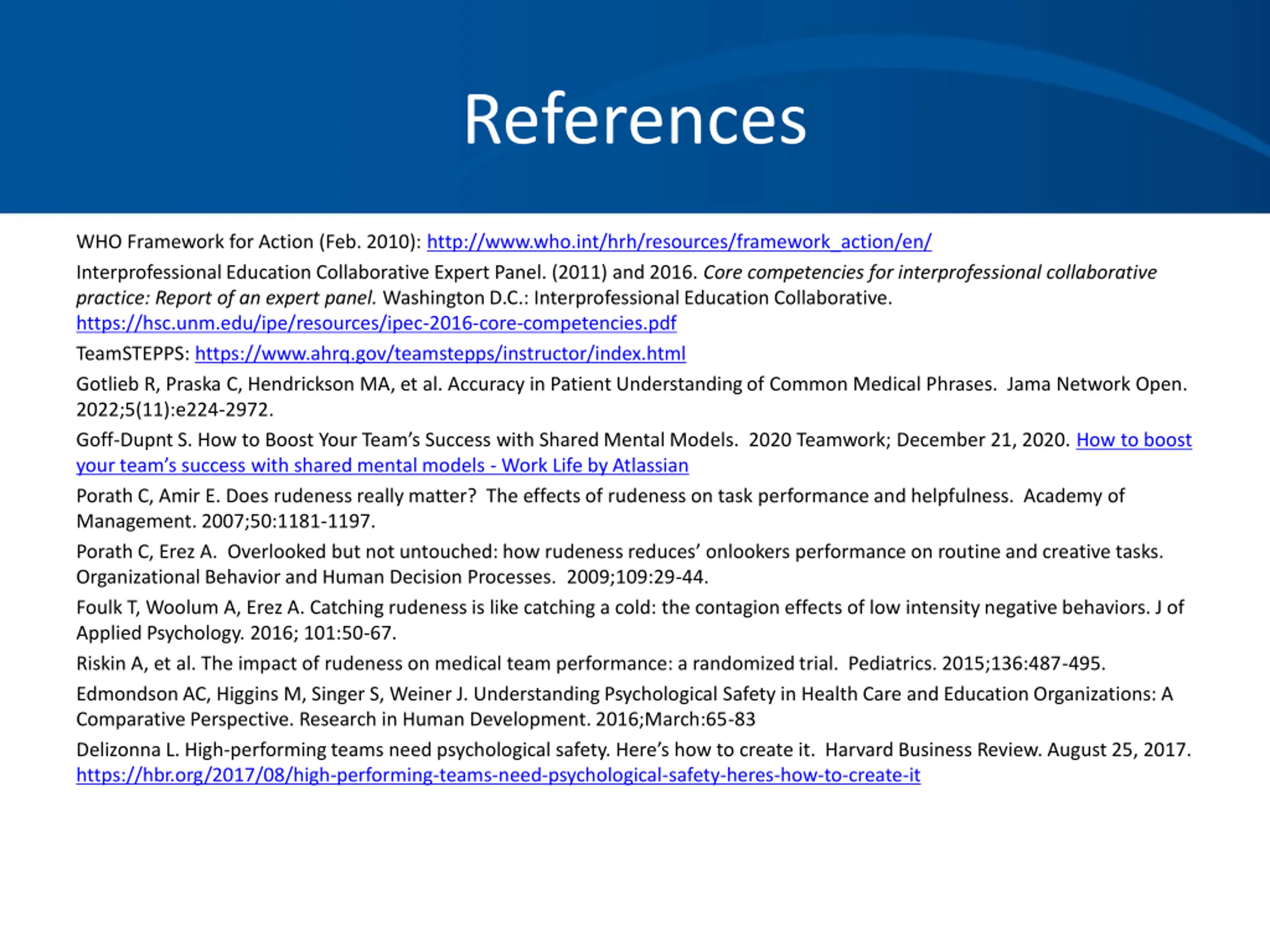 References WHO Framework for Action (Feb. 2010): http://www.who.int/hrh/resources/framework_action/en/ Interprofessional Education Collaborative Expert Panel. (2011) and 2016. Core competencies for interprofessional collaborative practice: Report of an expert panel. Washington D.C.: Interprofessional Education Collaborative. https://hsc.unm.edu/ipe/resources/ipec-2016-core-competencies.pdf TeamSTEPPS: https://www.ahrq.gov/teamstepps/instructor/index.html Gotlieb R, Praska C, Hendrickson MA, et al. Accuracy in Patient Understanding of Common Medical Phrases. Jama Network Open. 2022;5(11):e224-2972. Goff-Dupnt S. How to Boost Your Team s Success with Shared Mental Models. 2020 Teamwork; December 21, 2020. How to boost your team s success with shared mental models - Work Life by Atlassian Porath C, Amir E. Does rudeness really matter? The effects of rudeness on task performance and helpfulness. Academy of Management. 2007;50:1181-1197. Porath C, Erez A. Overlooked but not untouched: how rudeness reduces onlookers performance on routine and creative tasks. Organizational Behavior and Human Decision Processes. 2009;109:29-44. Foulk T, Woolum A, Erez A. Catching rudeness is like catching a cold: the contagion effects of low intensity negative behaviors. J of Applied Psychology. 2016; 101:50-67. Riskin A, et al. The impact of rudeness on medical team performance: a randomized trial. Pediatrics. 2015;136:487-495. Edmondson AC, Higgins M, Singer S, Weiner J. Understanding Psychological Safety in Health Care and Education Organizations: A Comparative Perspective. Research in Human Development. 2016;March:65-83 Delizonna L. High-performing teams need psychological safety. Here s how to create it. Harvard Business Review. August 25, 2017. https://hbr.org/2017/08/high-performing-teams-need-psychological-safety-heres-how-to-create-it