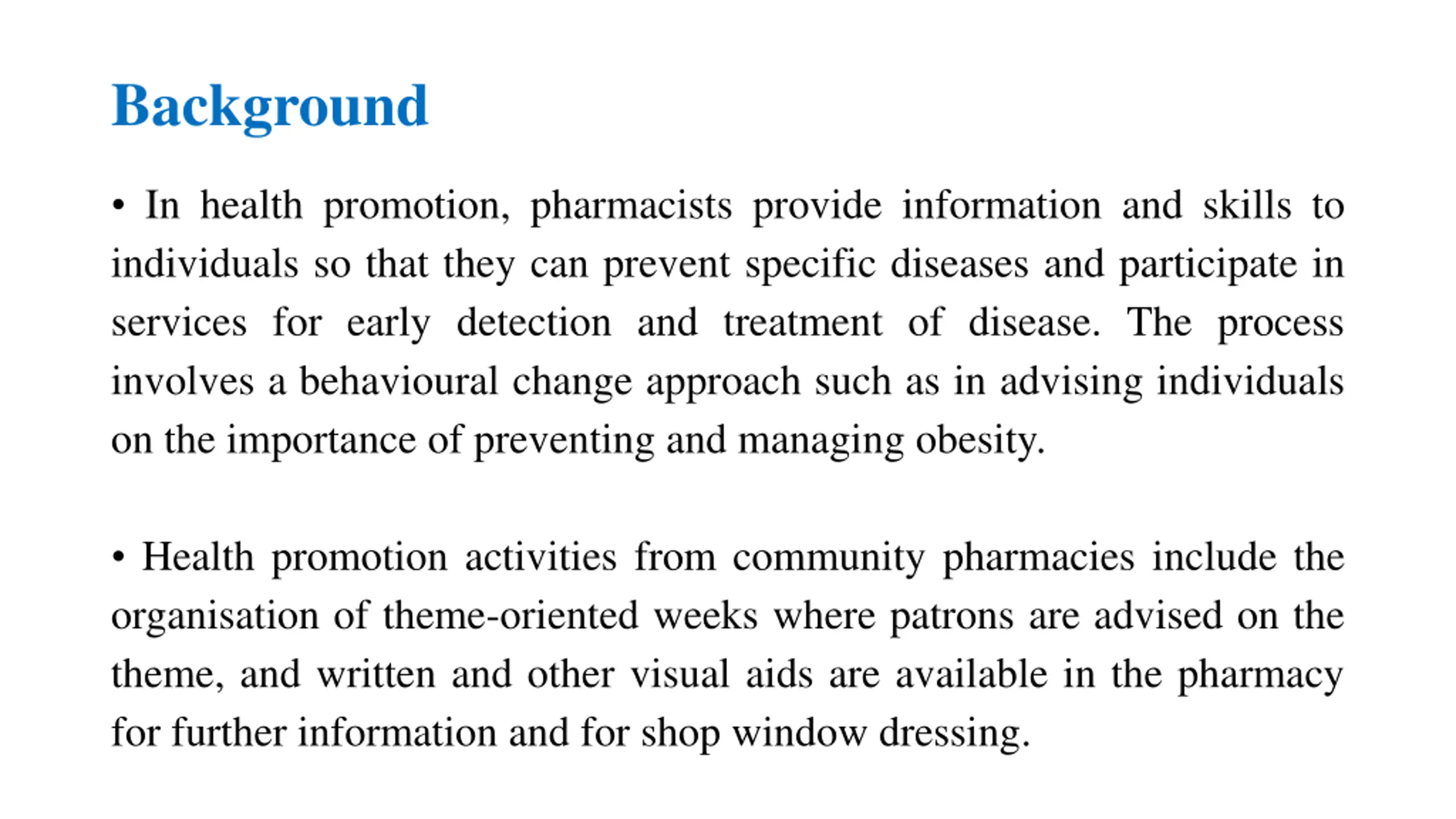 Background In health promotion, pharmacists provide information and skills to individuals so that they can prevent specific diseases and participate in services for early detection and treatment of disease. The process involves a behavioural change approach such as in advising individuals on the importance of preventing and managing obesity. Health promotion activities from community pharmacies include the organisation of theme-oriented weeks where patrons are advised on the theme, and written and other visual aids are available in the pharmacy for further information and for shop window dressing.